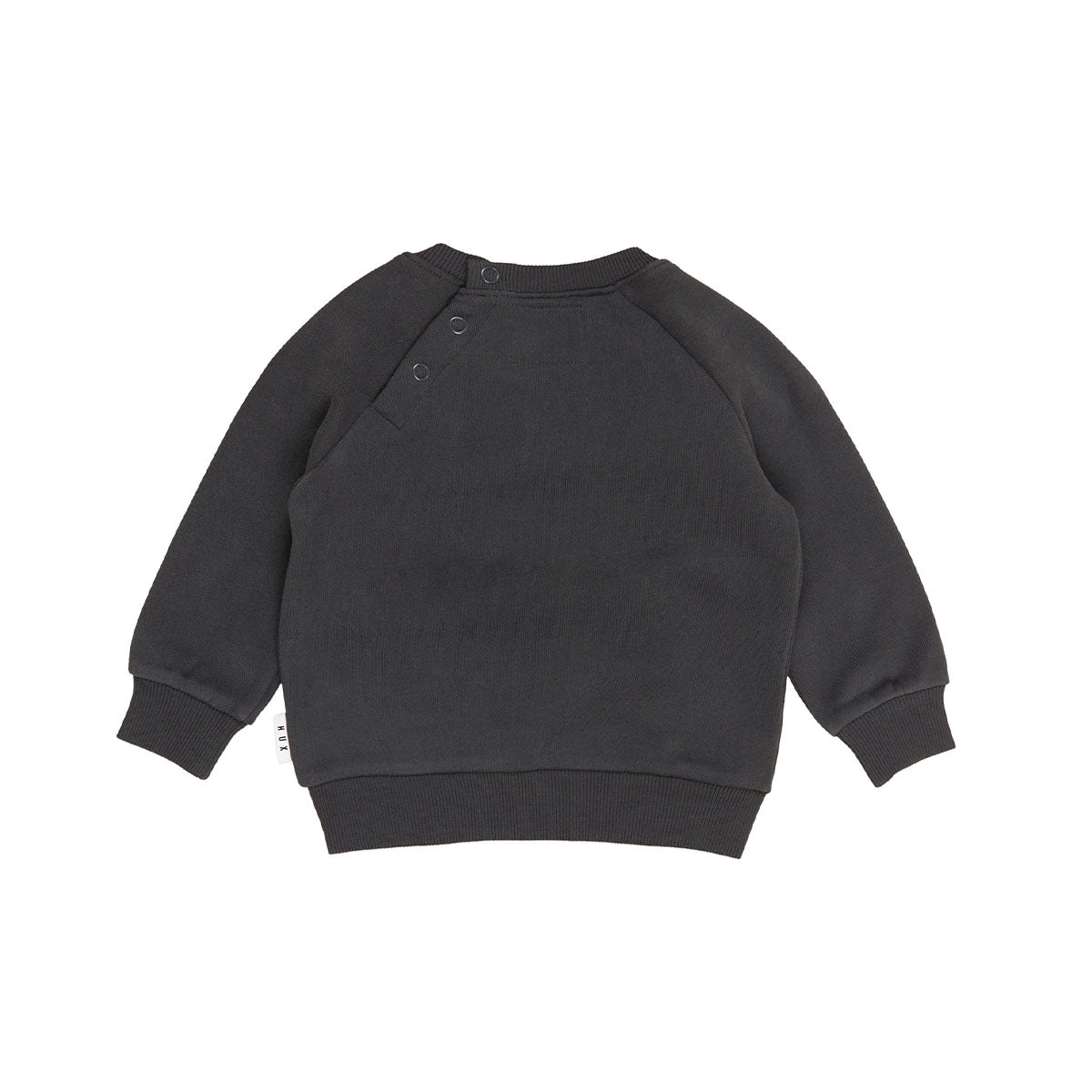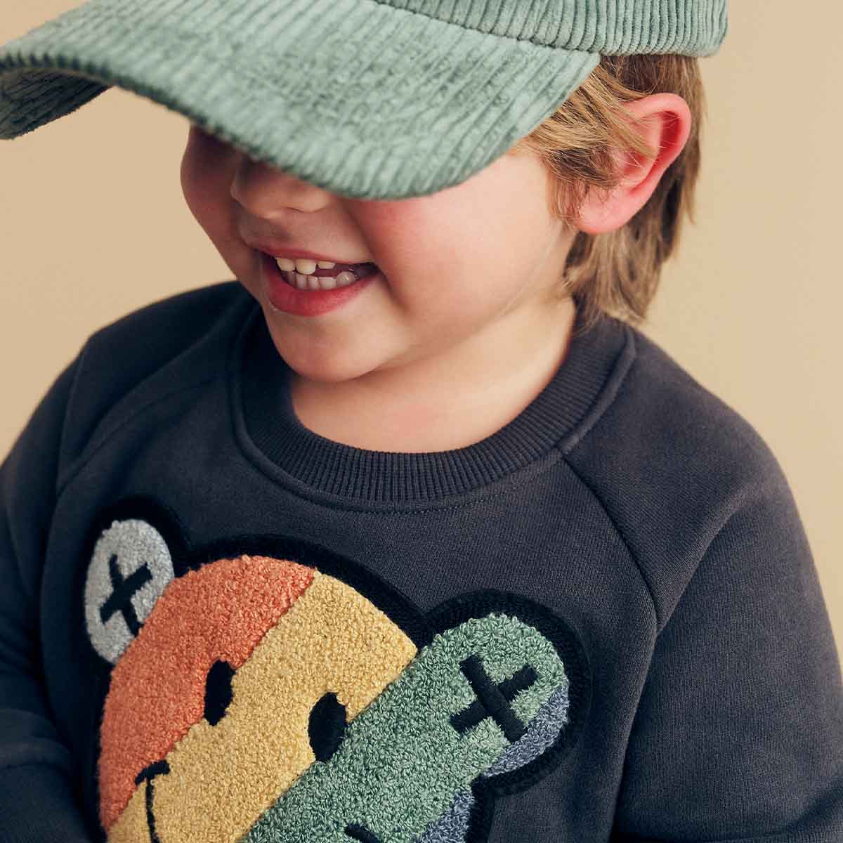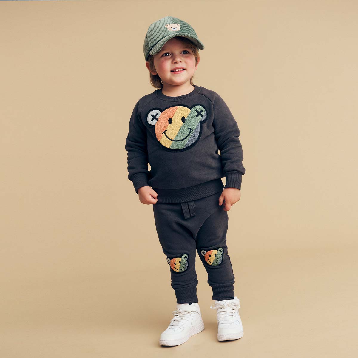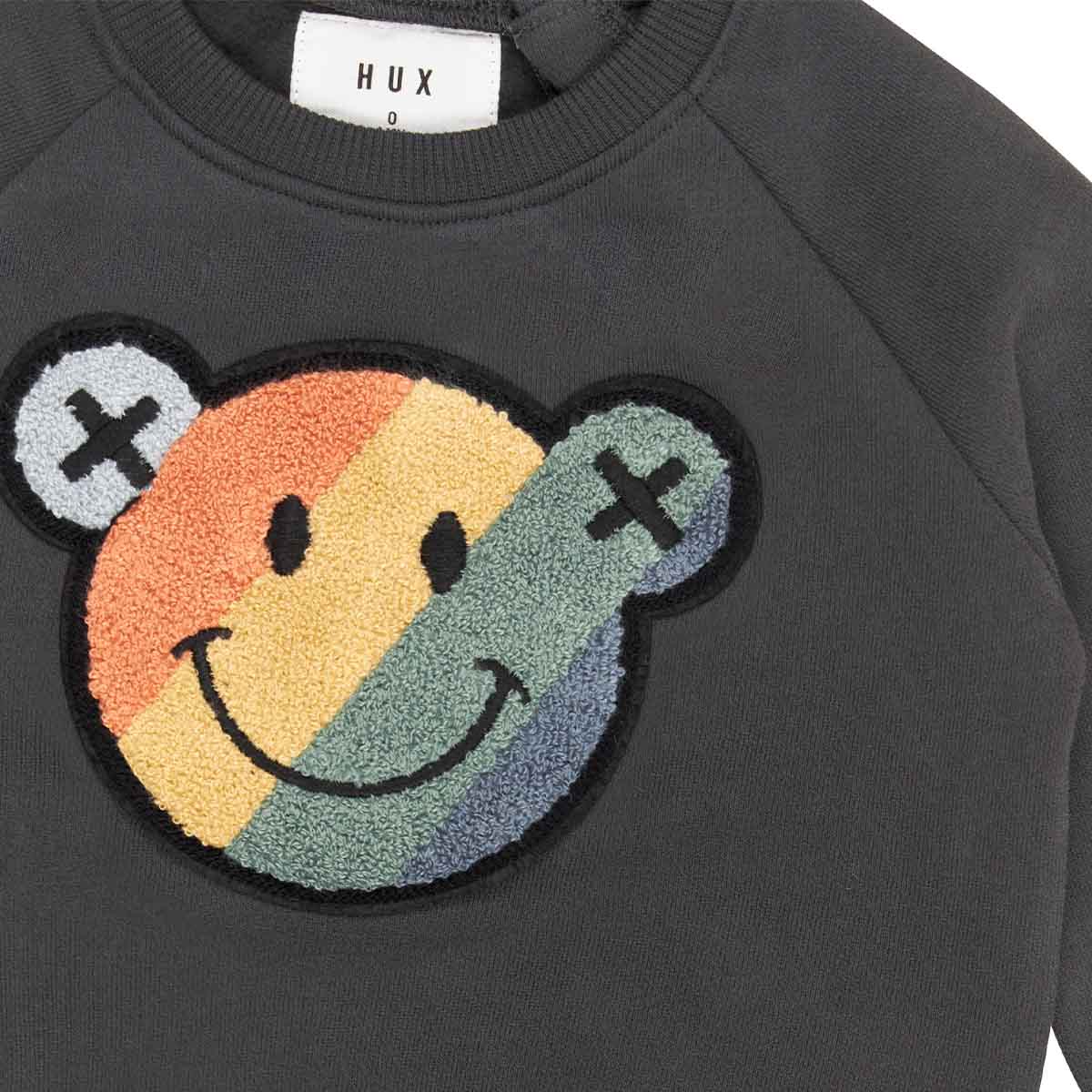 - - super soft, premium organic cotton fleece sweatshirt with looped embroidery rainbow smiley bear applique