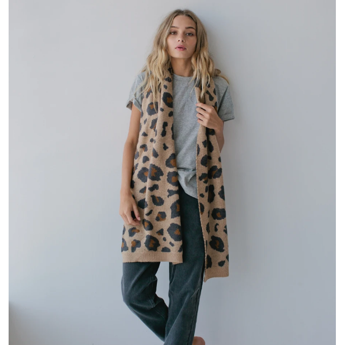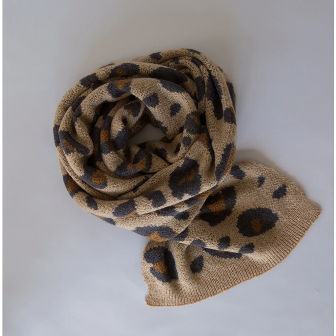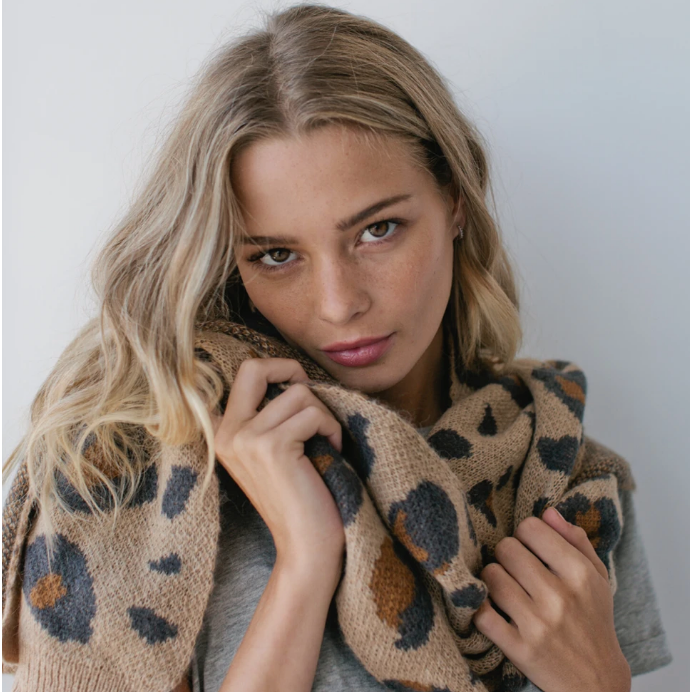 Wild: Further fueling our love of leopard. A big knitted jacquard scarf in classic neutral colours. Blended with mohair & wool.