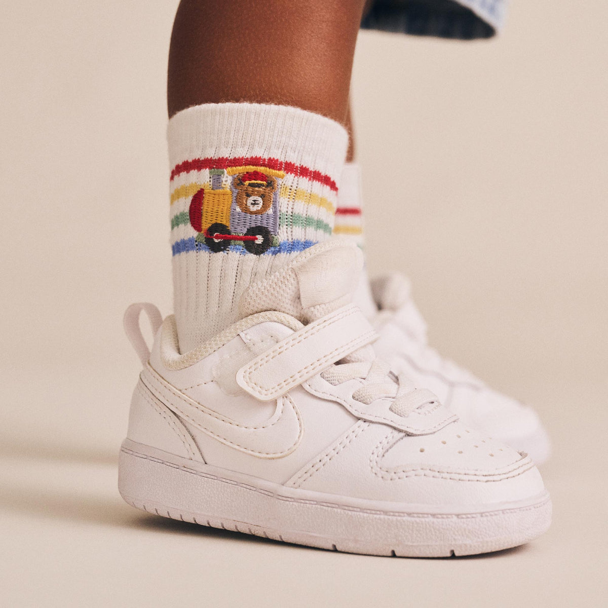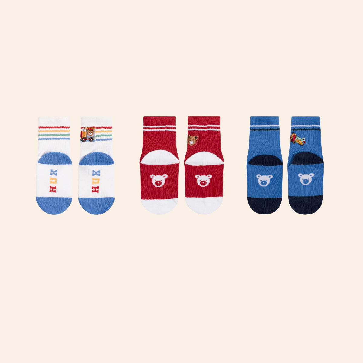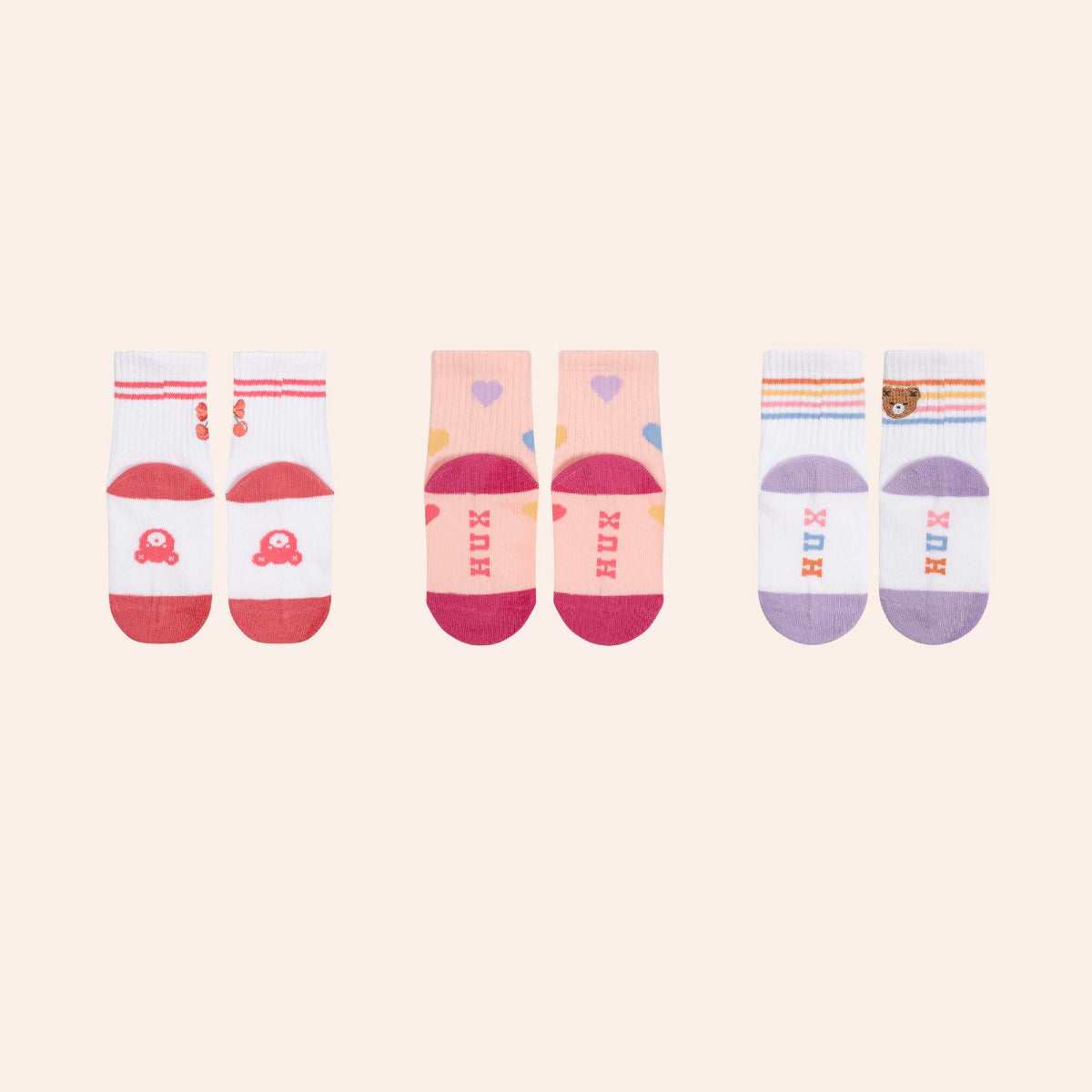 Three pairs of the softest, squishiest socks you'll ever meet. Made with a breathable blend of fibres to cushion busy feet. Your new everyday essentials, these sport-style socks are designed to mix and match with any Huxbaby outfit. Made with non-slip grippies on baby sizes 6-12 months.