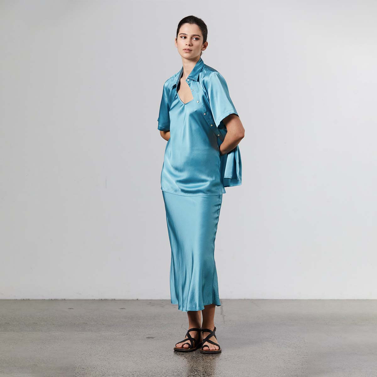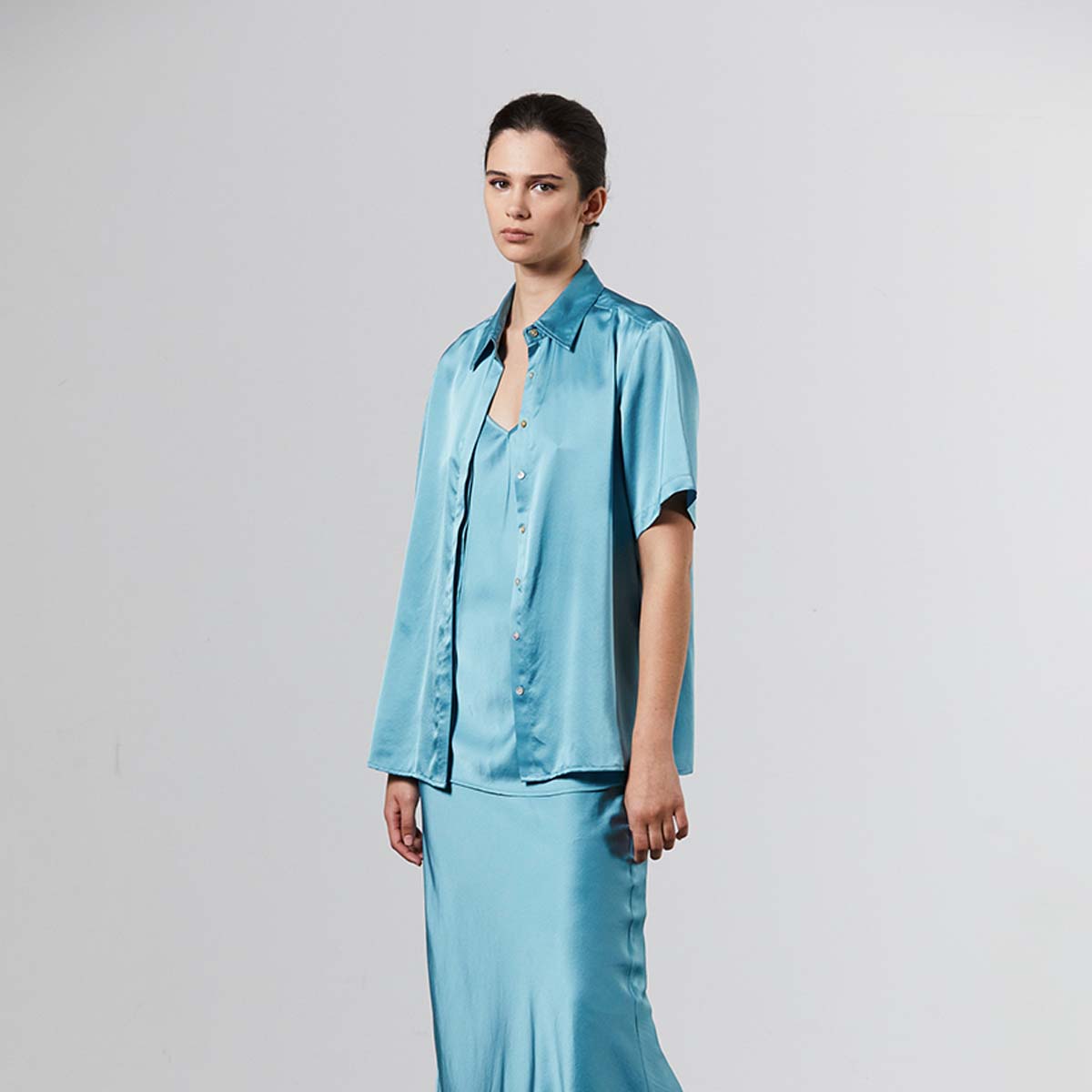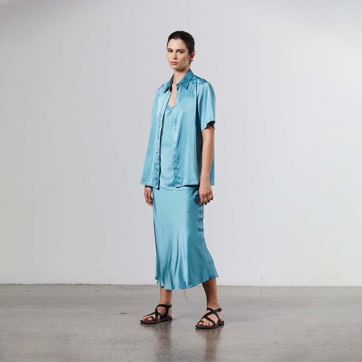 Relaxed summer style in our short sleeved silk shirt. The cut is generous and versatile in our beautiful summer colour of cerulean. Wear on its own with your favourite bottoms or back with our silk satin midi skirt. Open as a simple silk shacket over the matching slip dress.