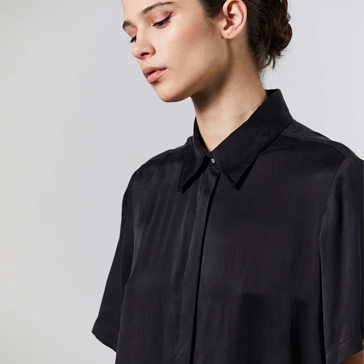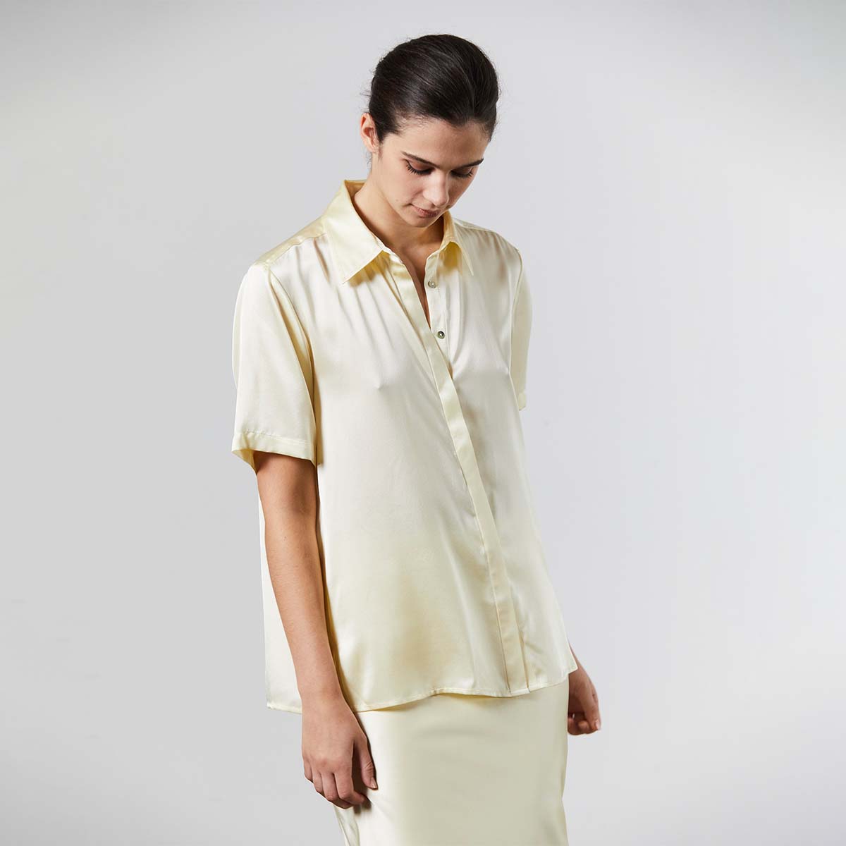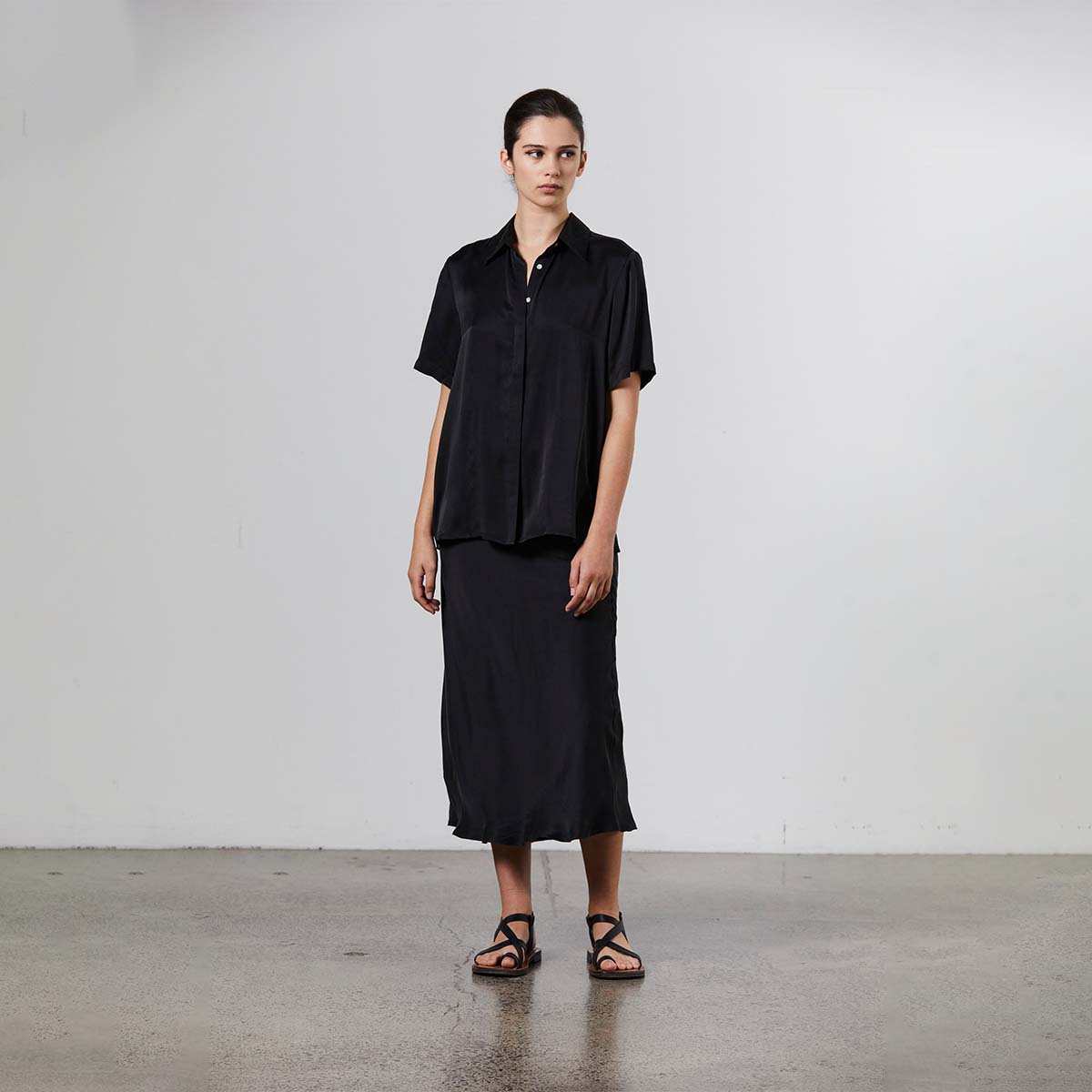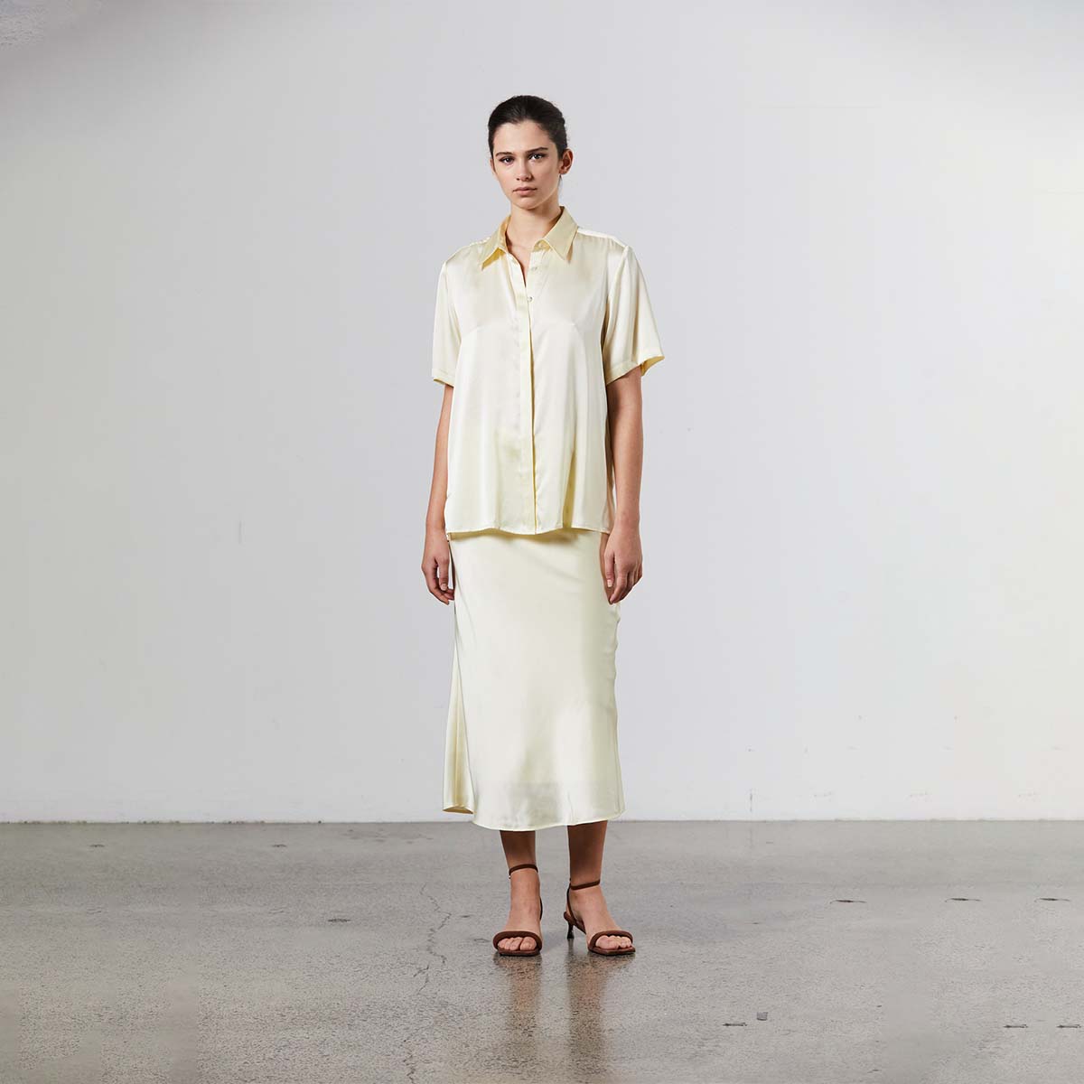 Relaxed summer style in our short sleeved silk shirt. The cut is generous and versatile in our beautiful summer colour of cerulean. Wear on its own with your favourite bottoms or back with our silk satin midi skirt. Open as a simple silk shacket over the matching slip dress.