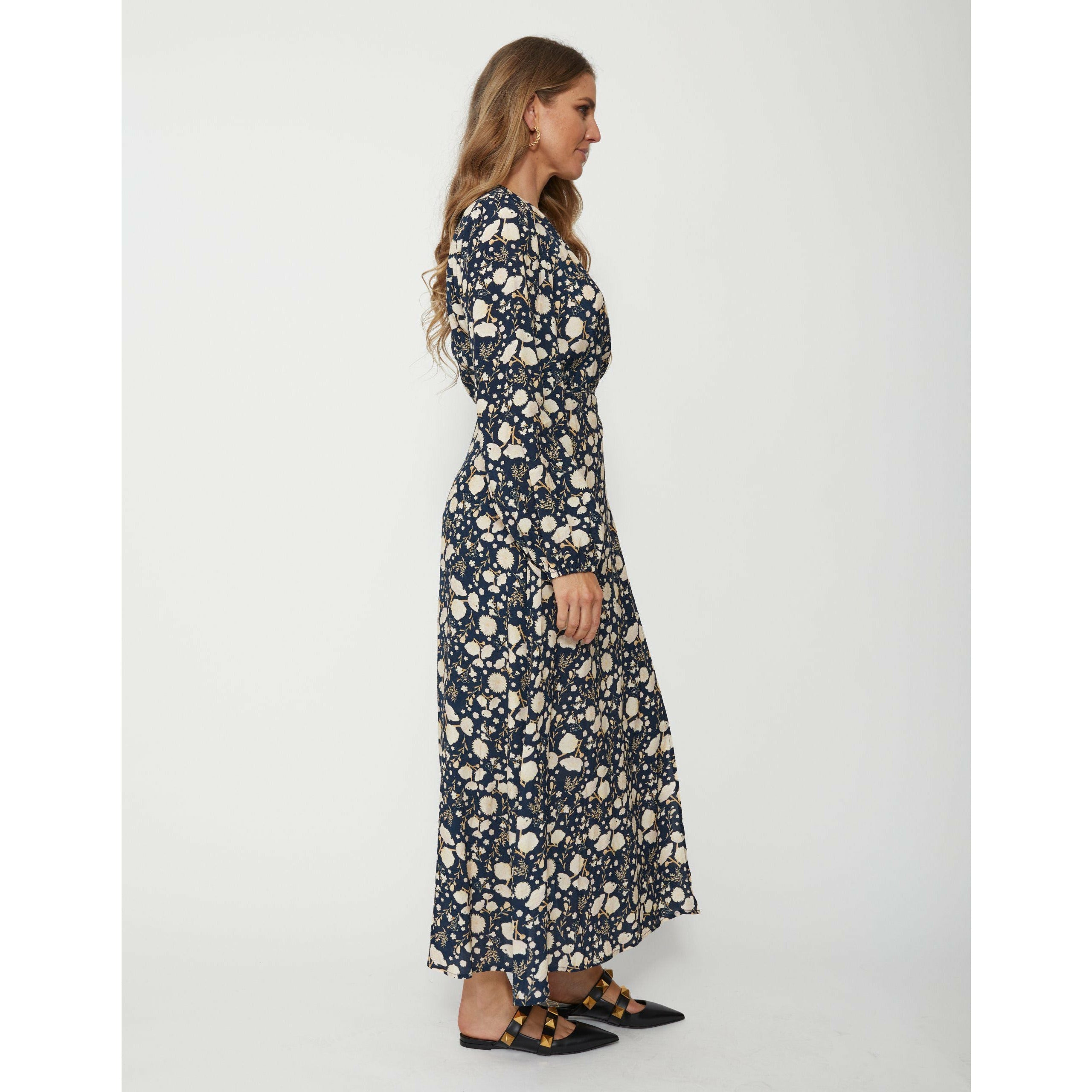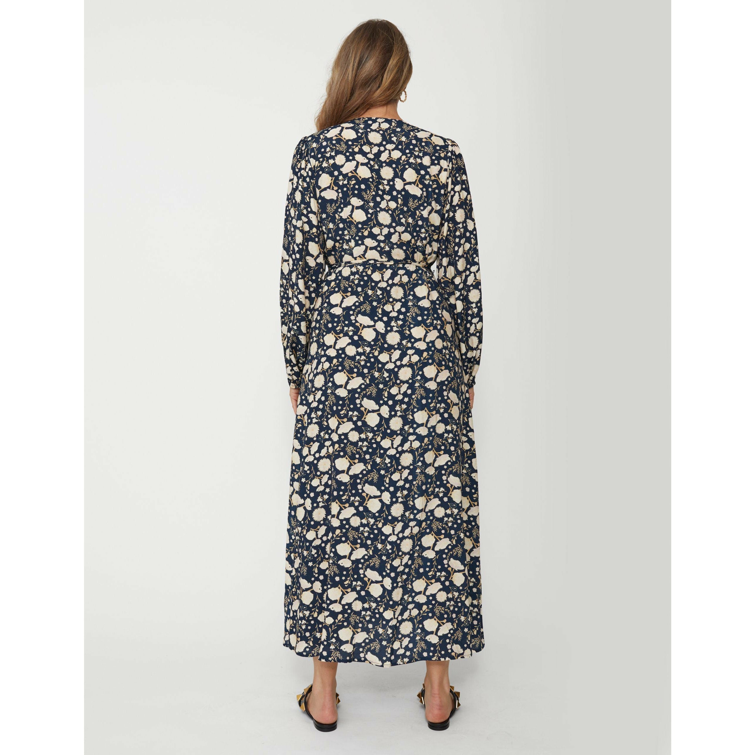 Deep v wrap dress with waist tie and A line skirt. Gathered sleeve head with balloon sleeve to narrow cuff.