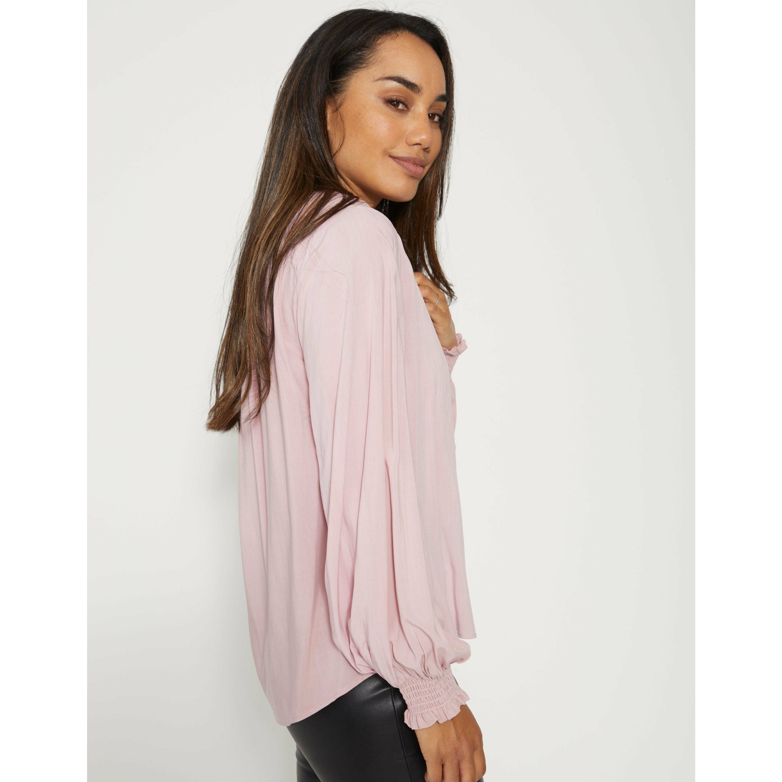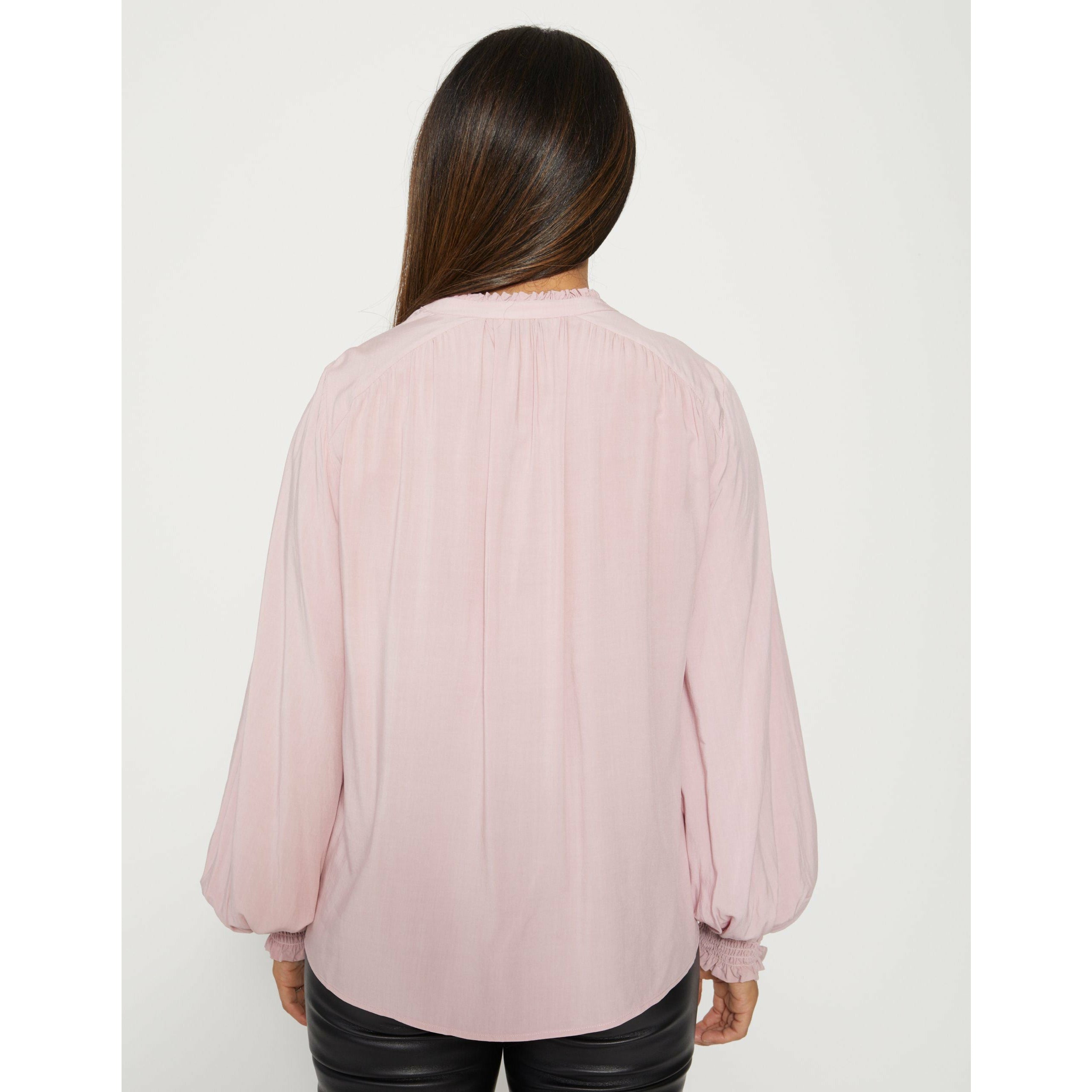V neck blouse with ruffle trim collar and shirred cuffs.
