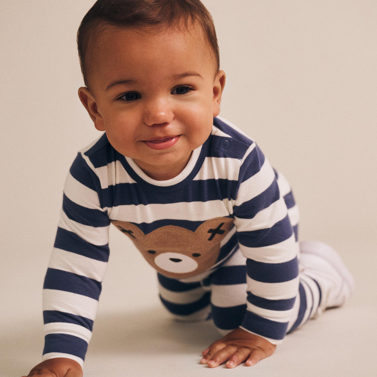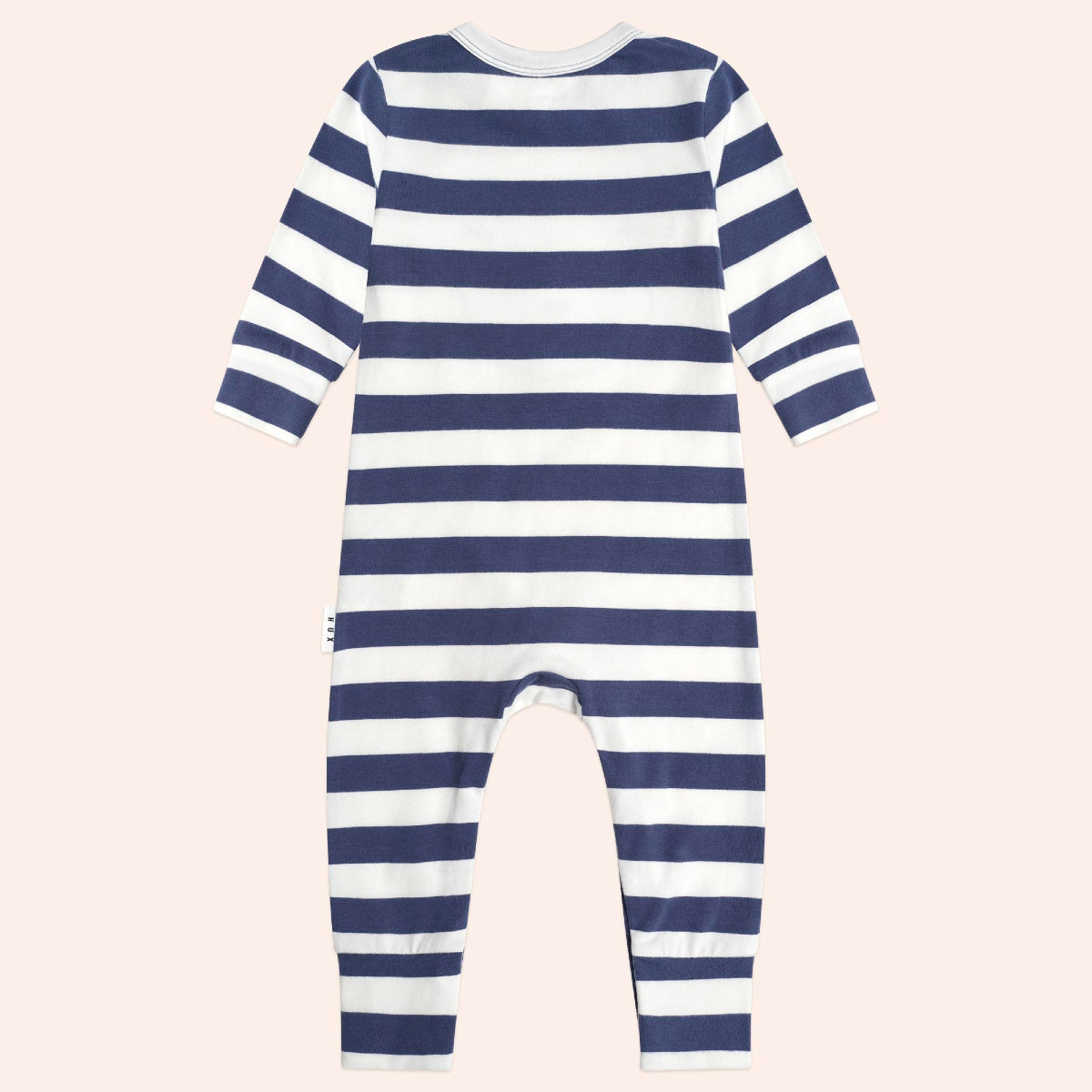 A marshmallow-soft striped romper with fun and furry Huxbear embroidery. Consciously crafted from premium organic cotton, it has stainless steel snaps at the shoulder and crotch for super snappy dressing. Just add squishy legs.