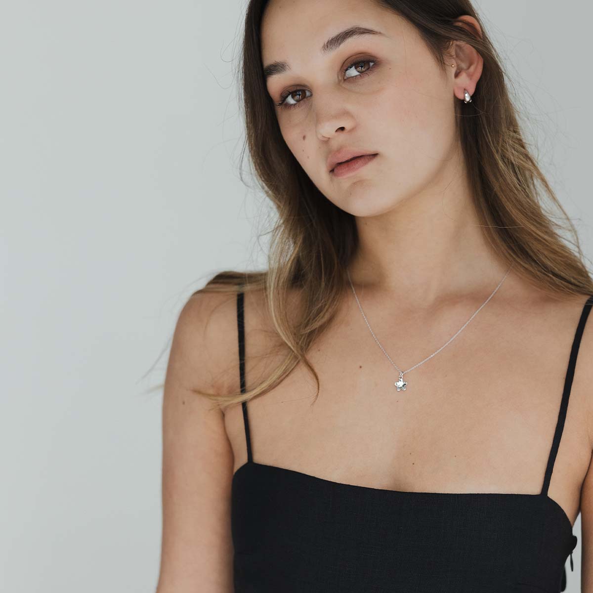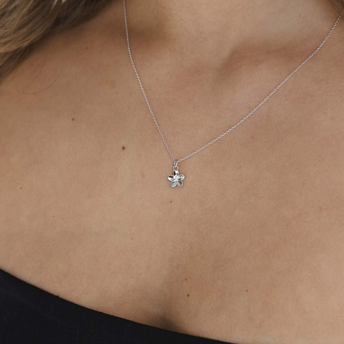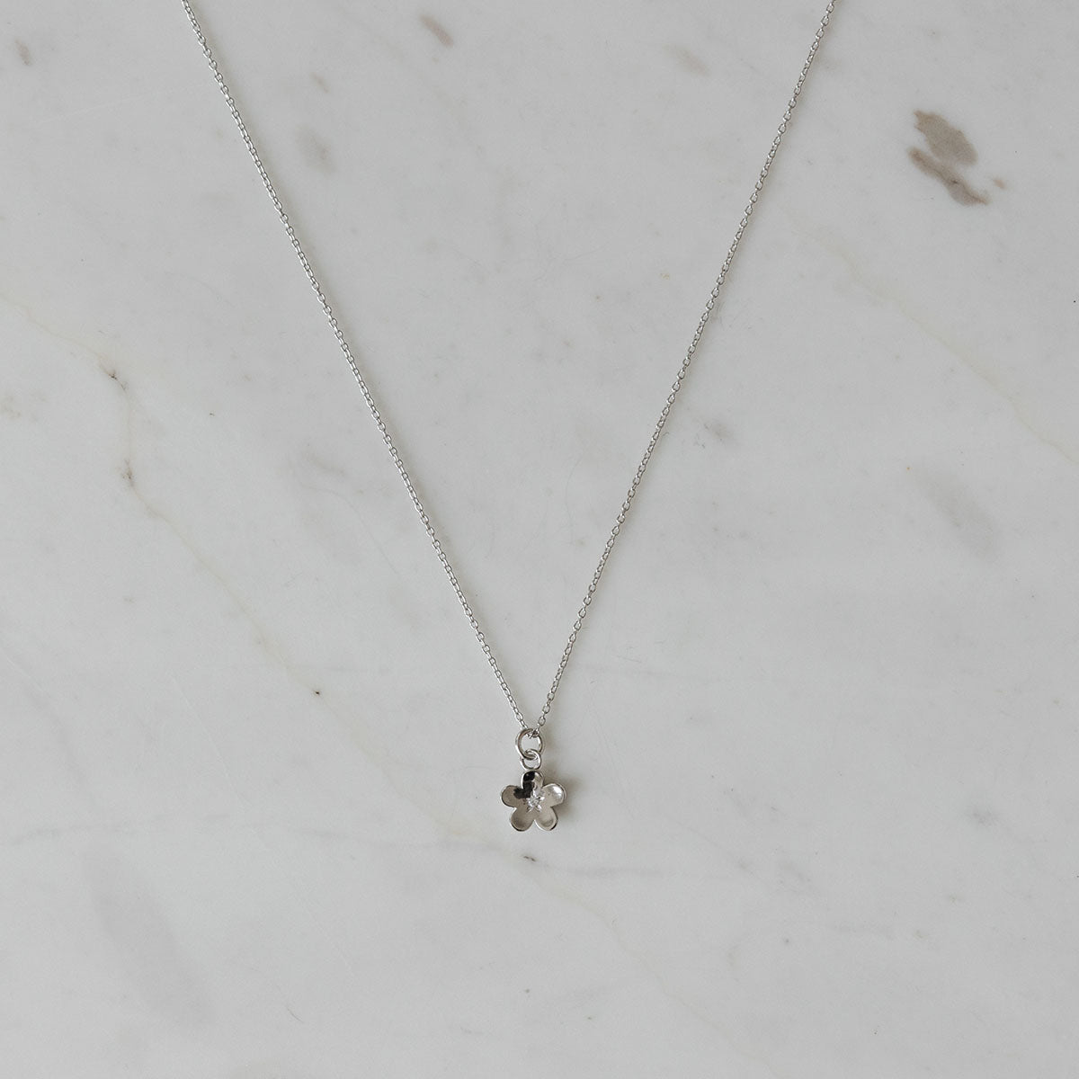 A large daisy pendant w. zircon on a simple longer chain necklace.