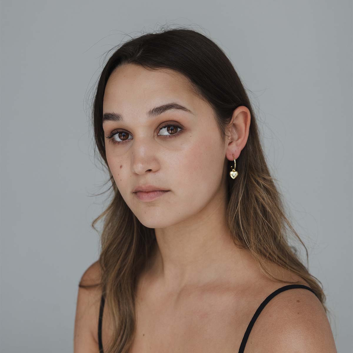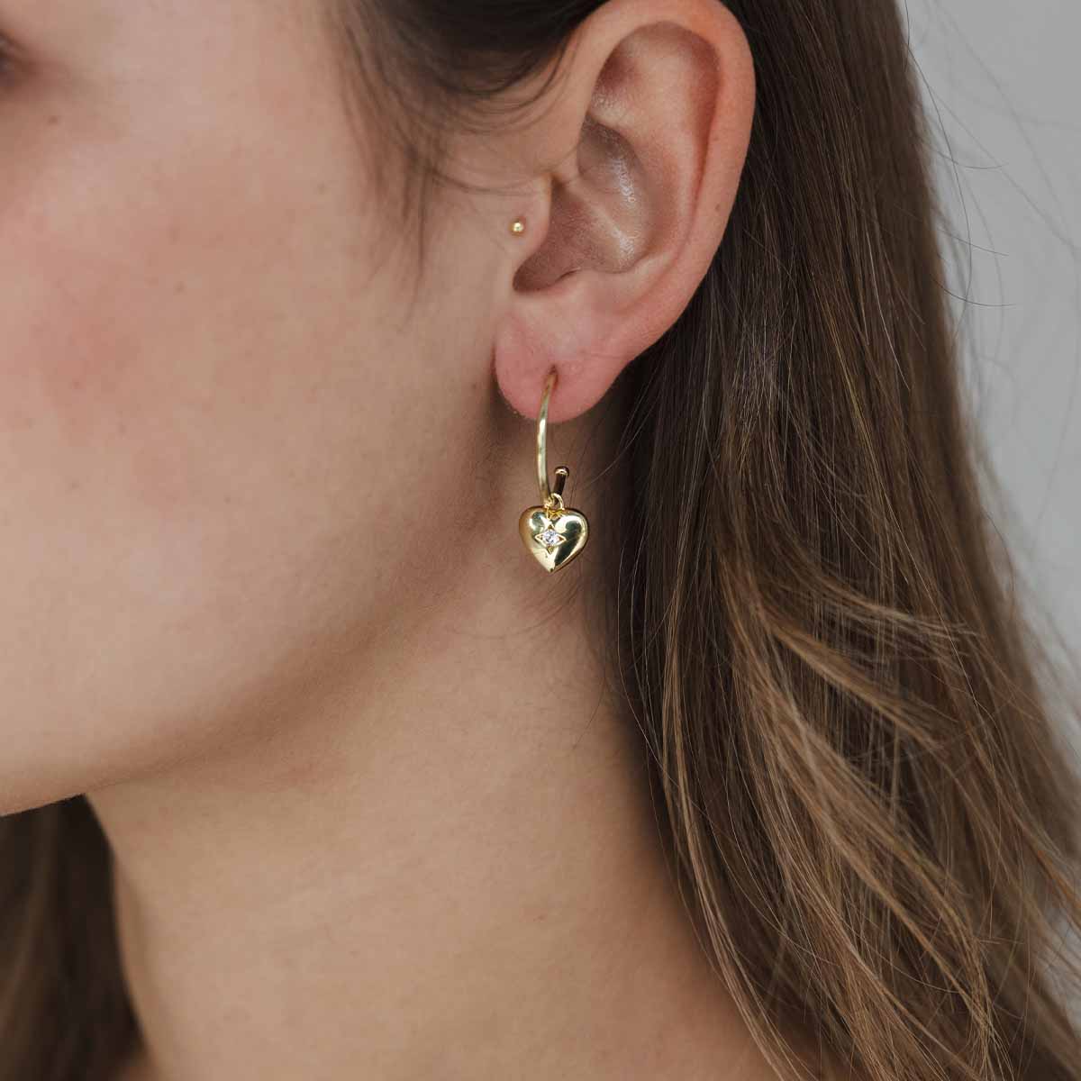 A large heart charm featuring a clear zircon on a large hoop stud. Pendant removable for a classic second look.