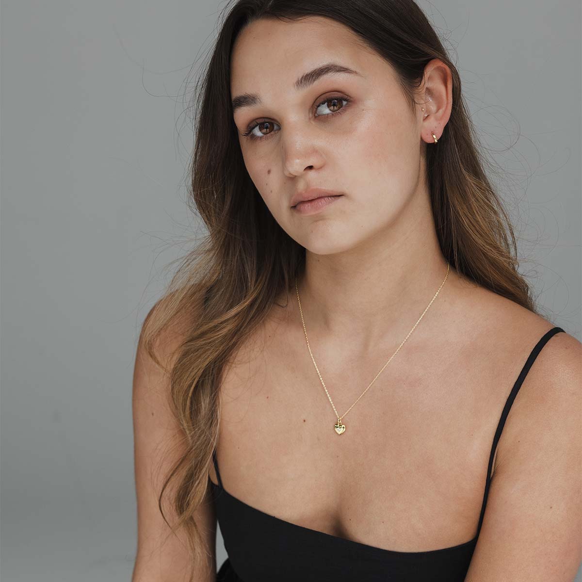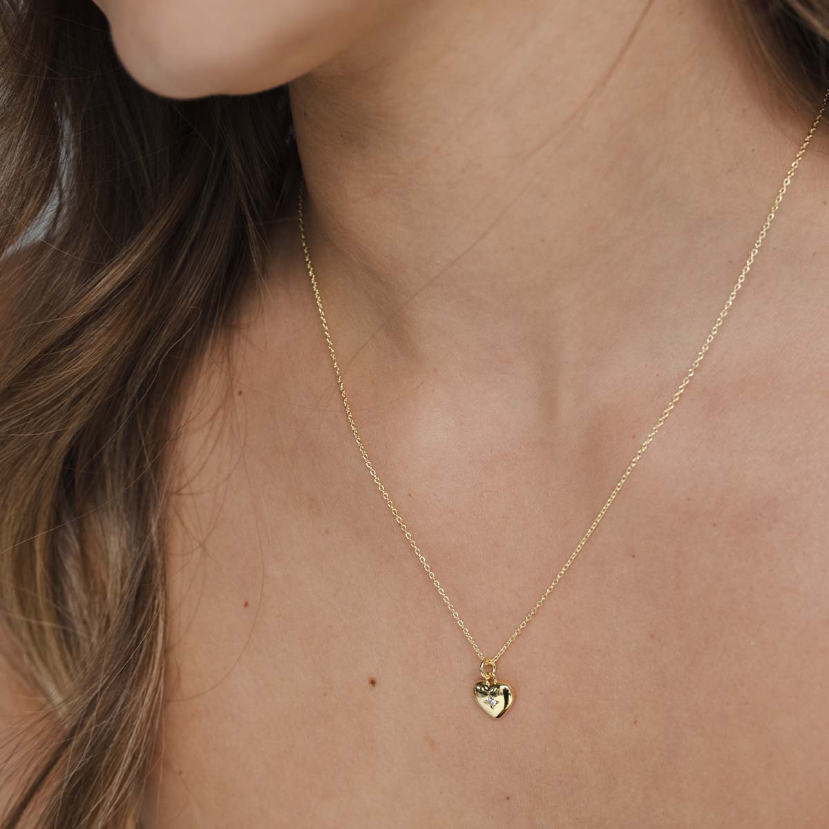 A large heart pendant w. zircon on a simple longer chain necklace.