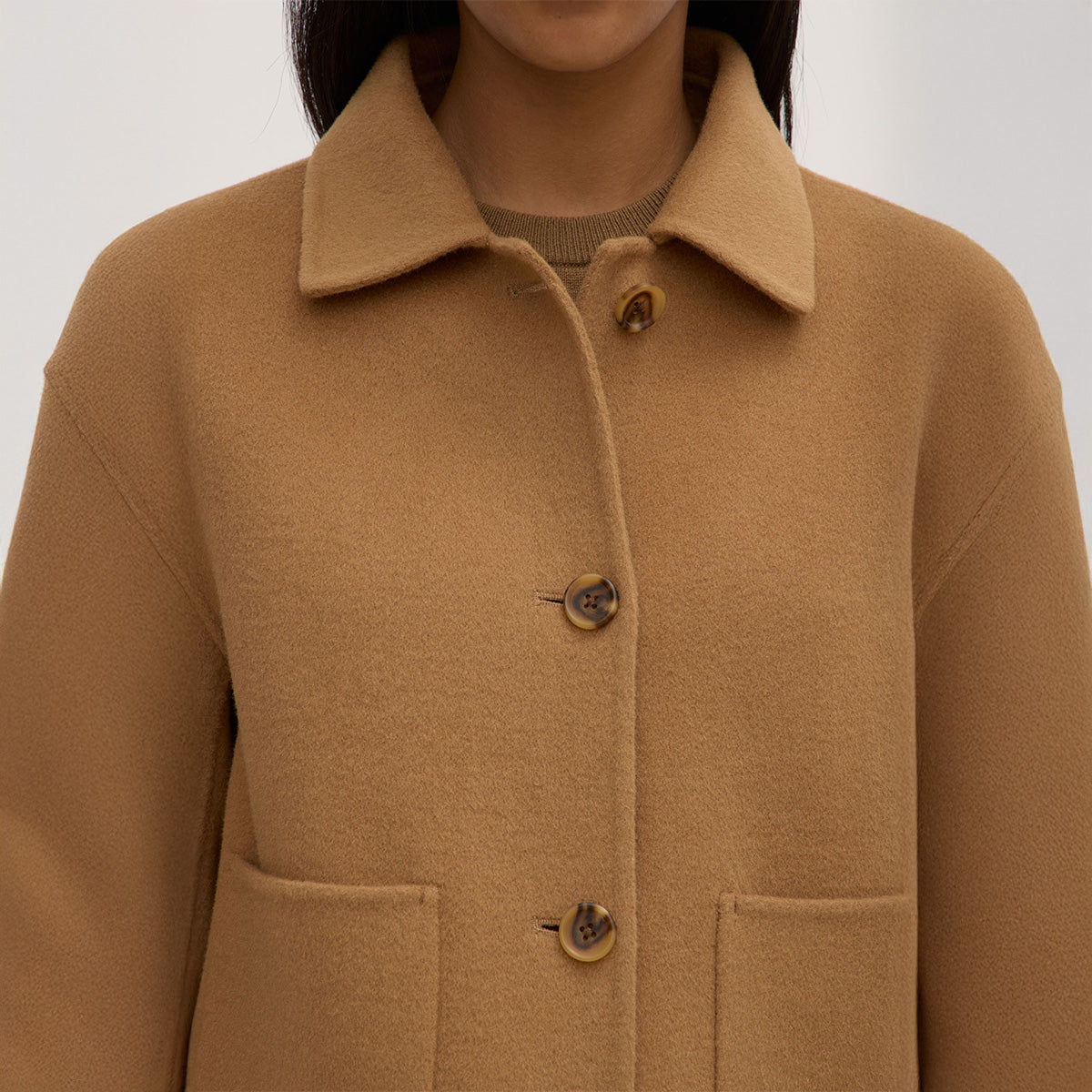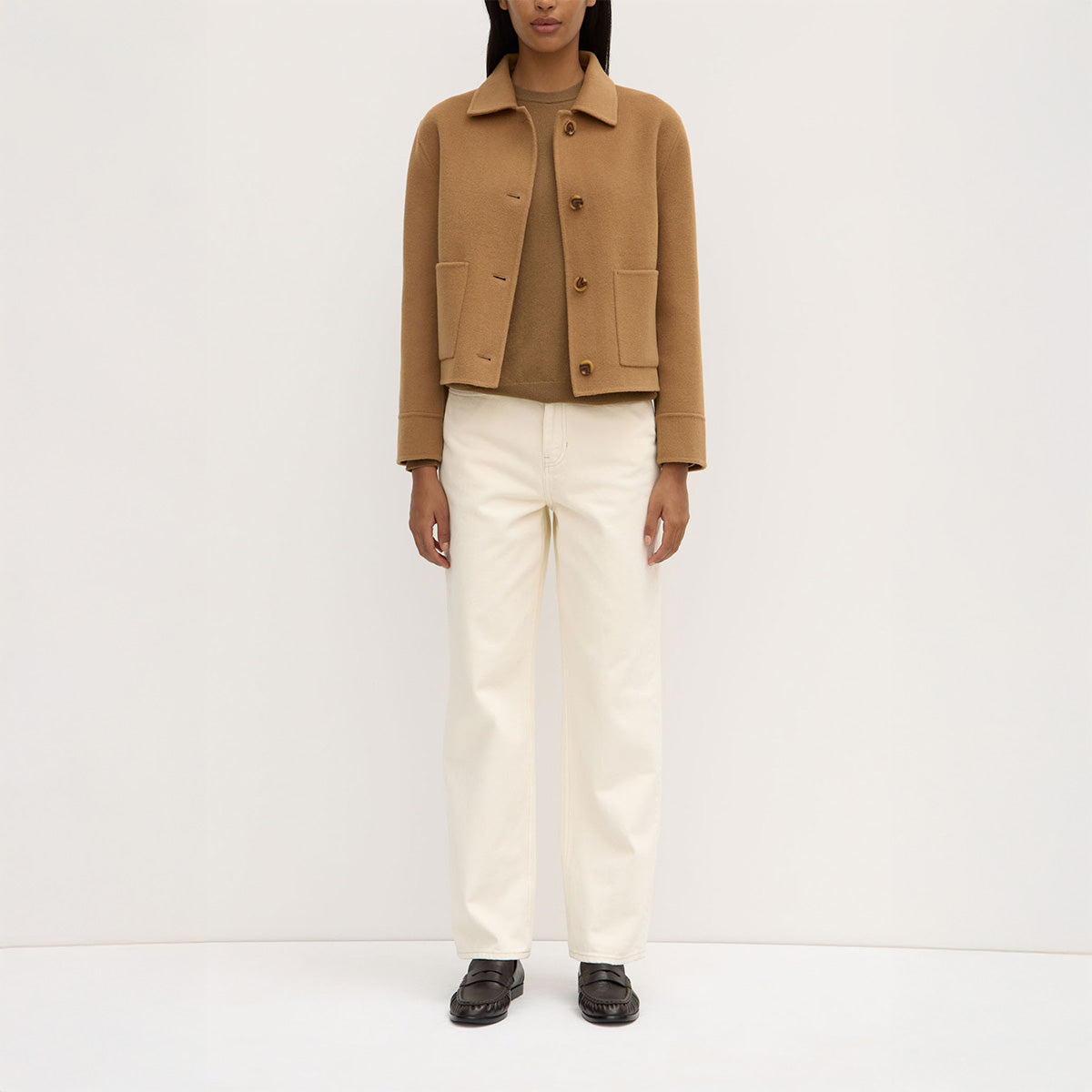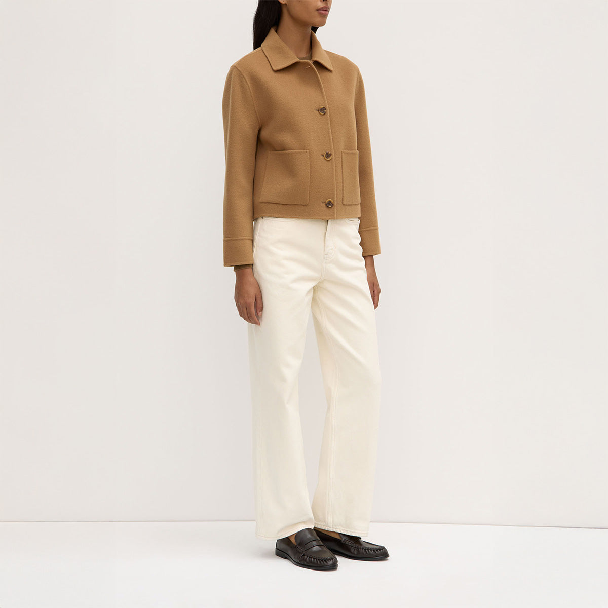 Made from 100% wool, the Tasmin Jacket is the most cropped and boxy of the wool outerwear range. Featuring button-down front and front patch pockets, it can be styled effortlessly over your favourite lightweight layers.