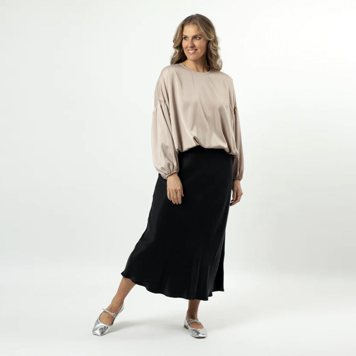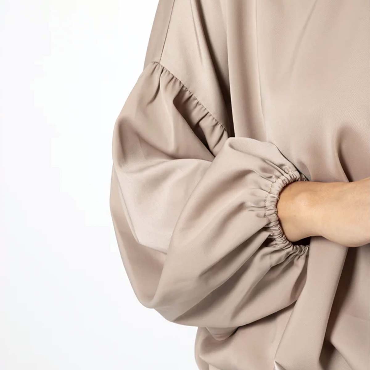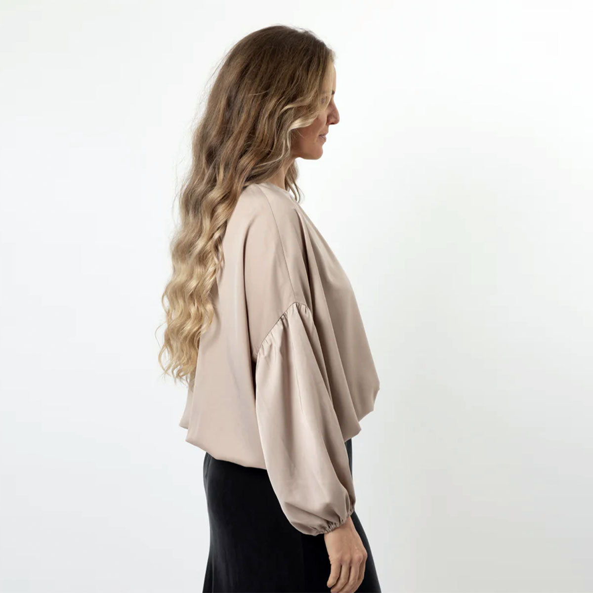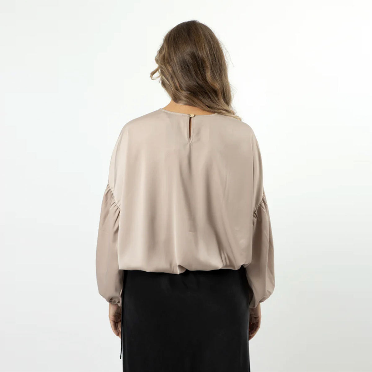 Crew neck blouse with full bloused bodice, elasticated cuffs and hemline. Full sleeves with seam and gathered cuff. Back neck keyhole split and gold logo button