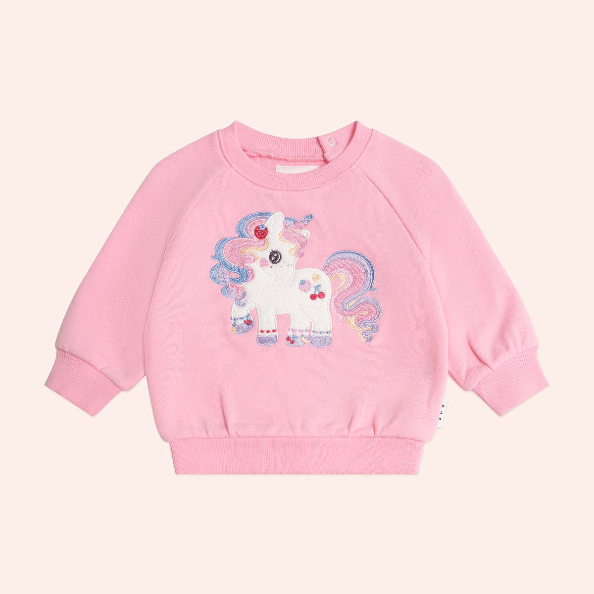 Proof unicorns do exist. At least at Hux, and in little imaginations. This warm and cosy terry sweatshirt is made from fluffy organic cotton, it features a sparkly tutti frutti unicorn embroidery on the tummy and stainless steel back snaps in baby sizes. Match it with our Tutti Frutti Unicorn Track Pant for a co-ord look.