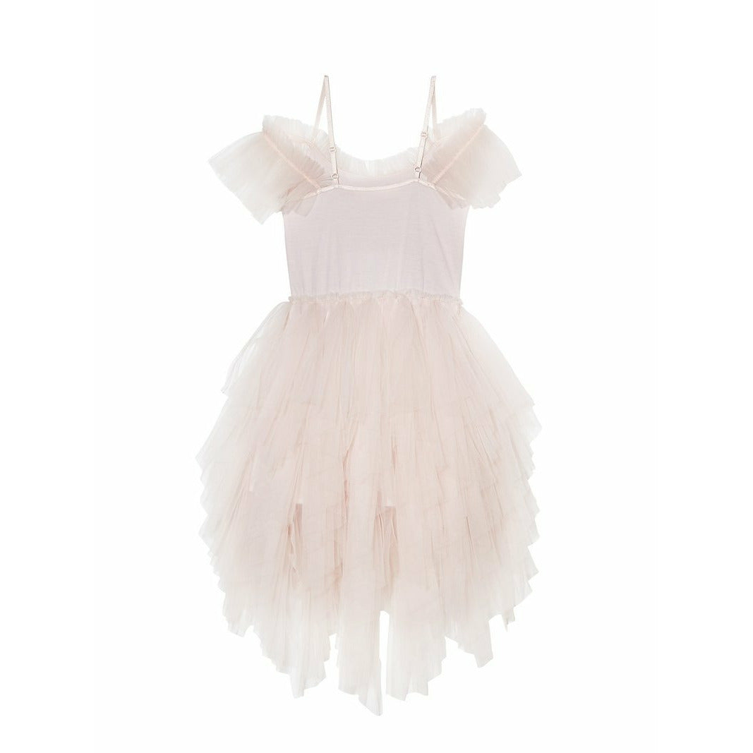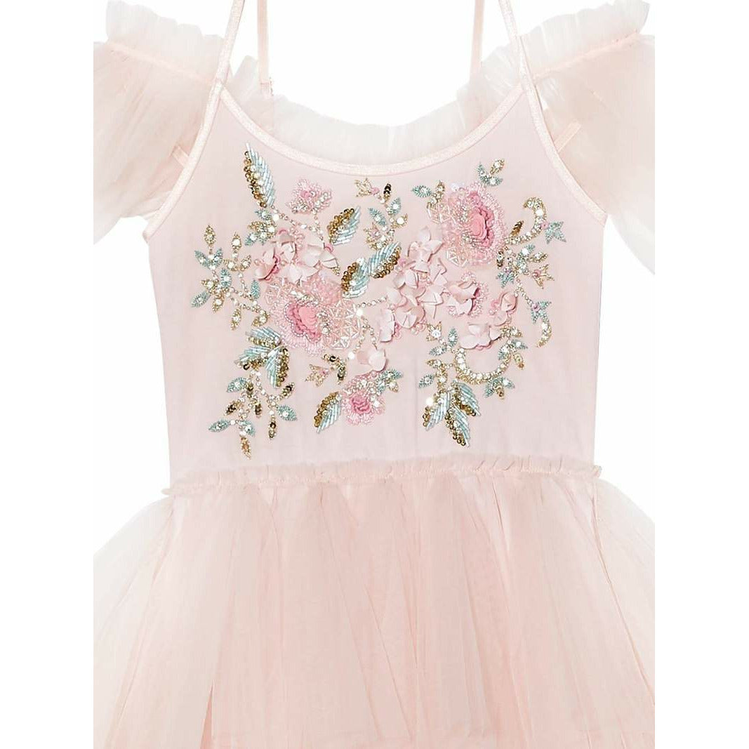 The Rose Tutu Dress is delicately detailed and exquisitely ornate. The bodice features a stunning wreath of silky blooms and blossoms, embellished with glittering sequins, dazzling beads and luminescent pearls. There are floaty off-the-shoulder cap sleeves, and a pretty ruffle along the neckline. With the high-low skirt falls in vertically gathered tulle layers, the ultimate showstopper!