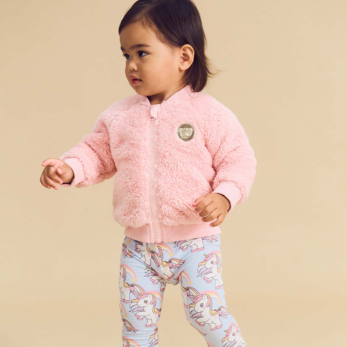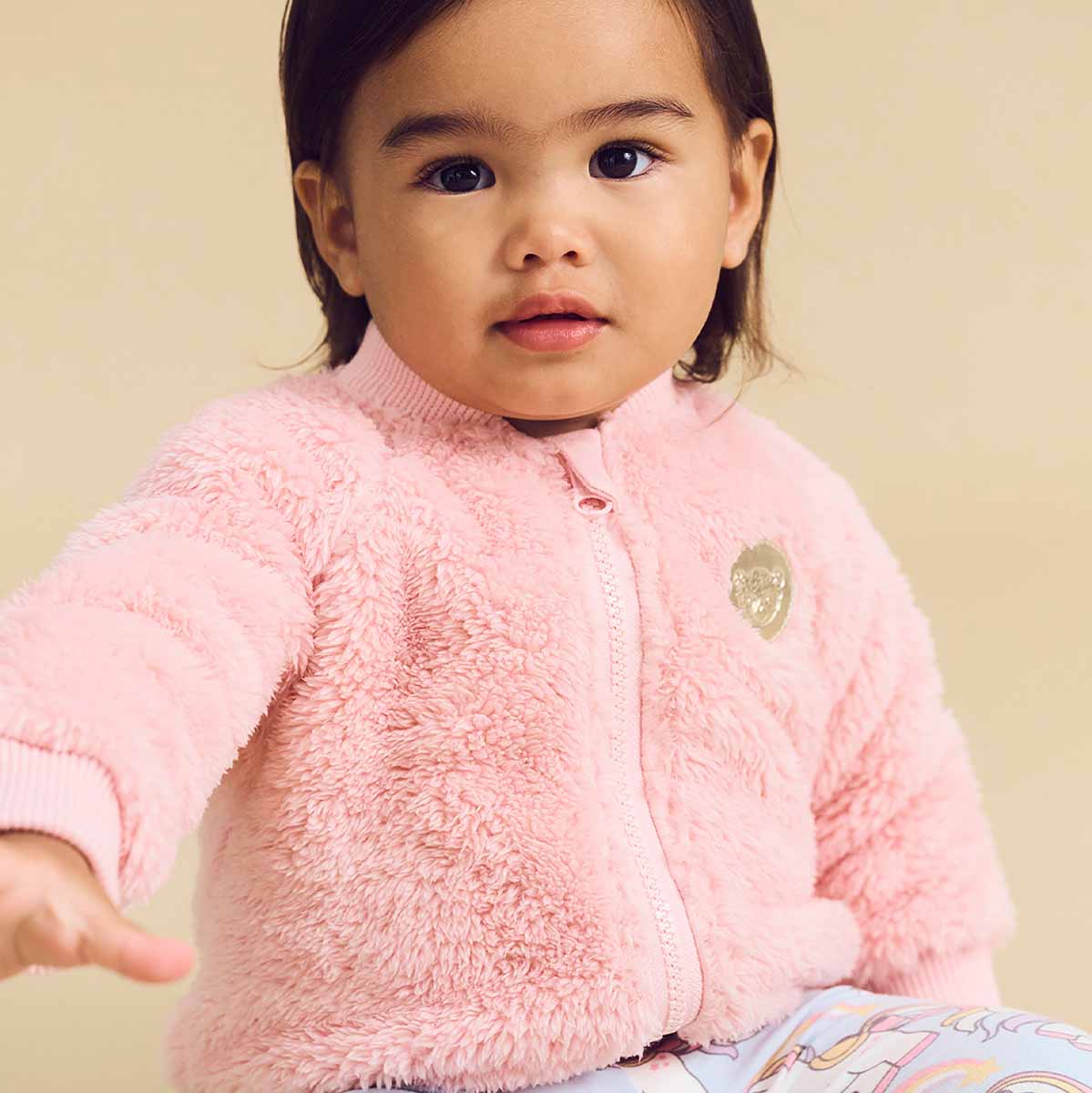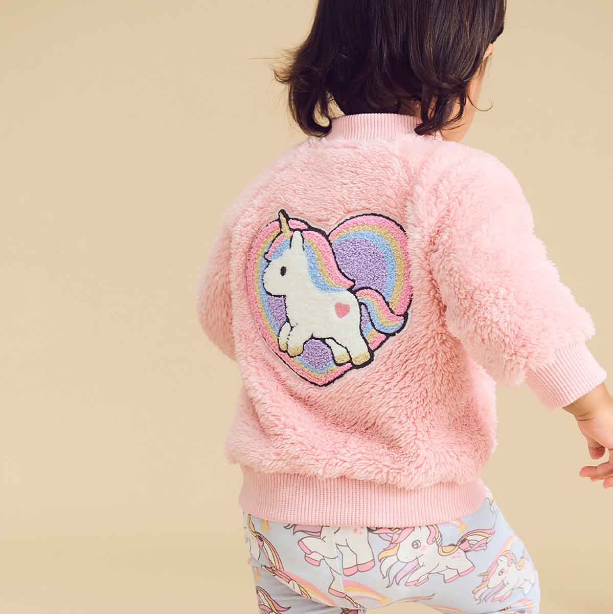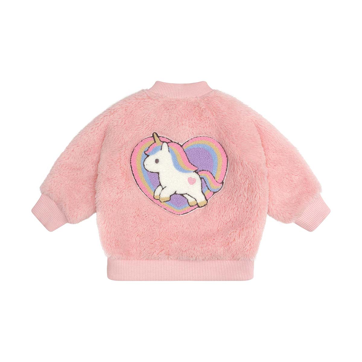 • Soft furry zip jacket with unicorn heart appliqué patch on back