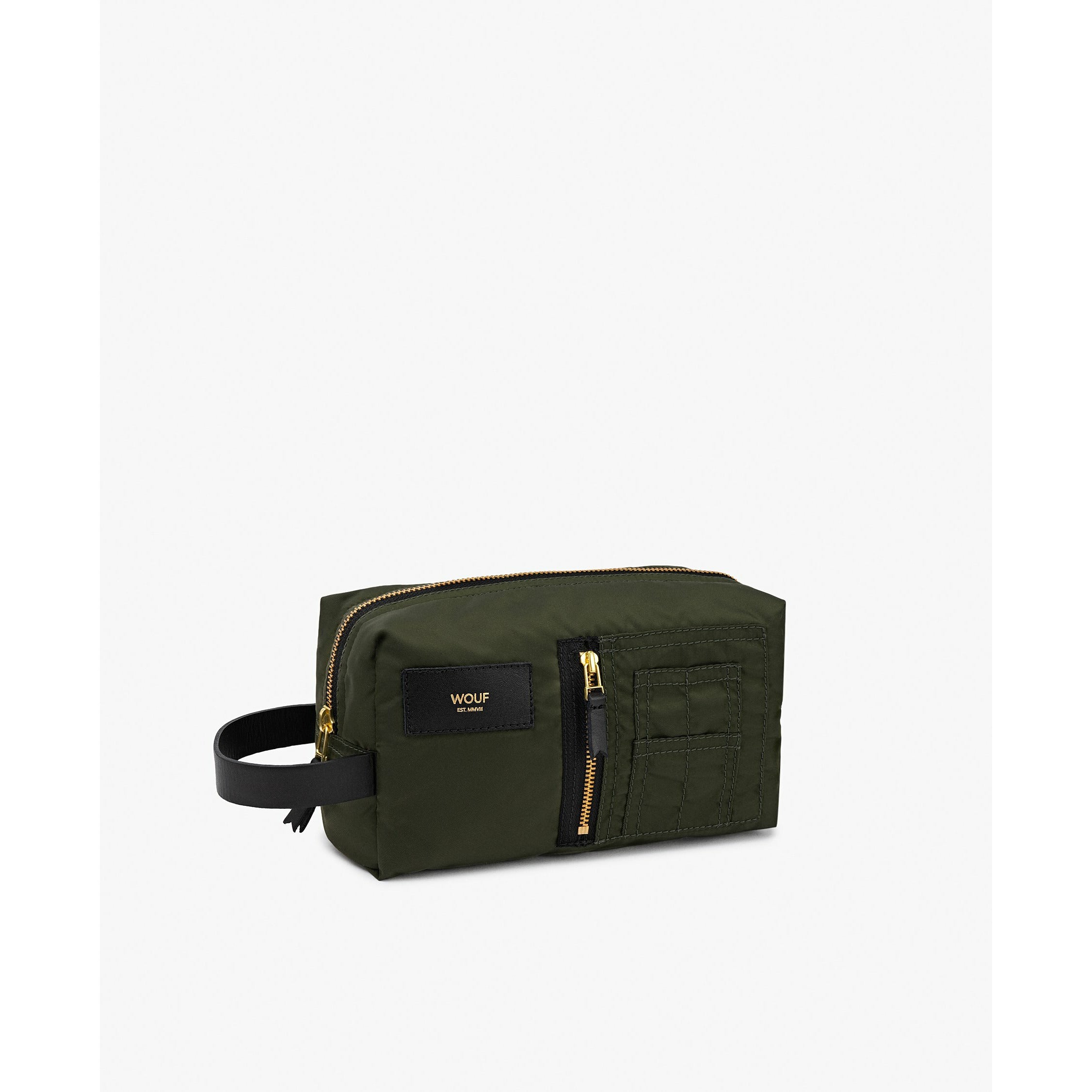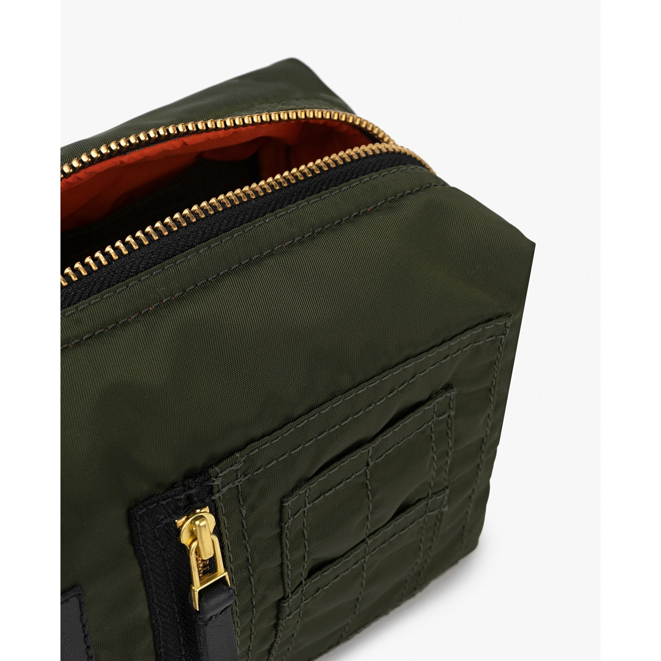 Water repellent and quilted Italian nylon with detail in leather. One large inner compartment with two interior pockets and one exterior.