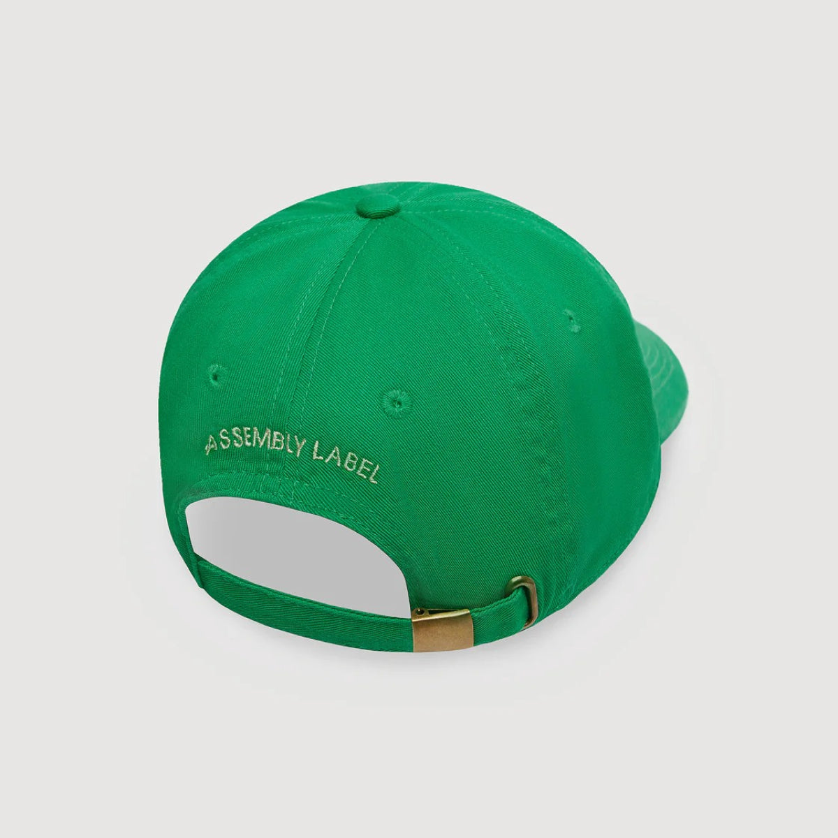The Everyday Cap in bright green is a 100% cotton, unstructured six-panel cap with a curved visor, embroidered branding, and an adjustable brass closure.