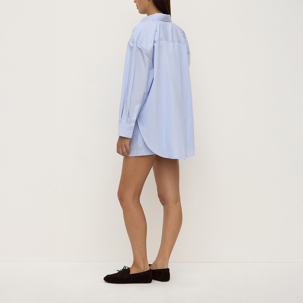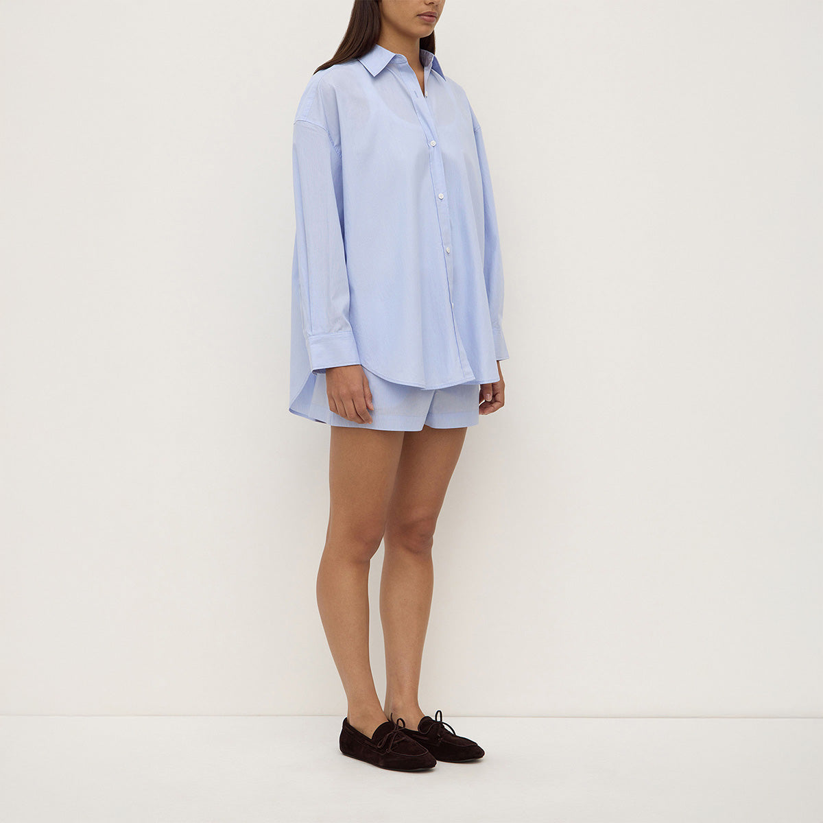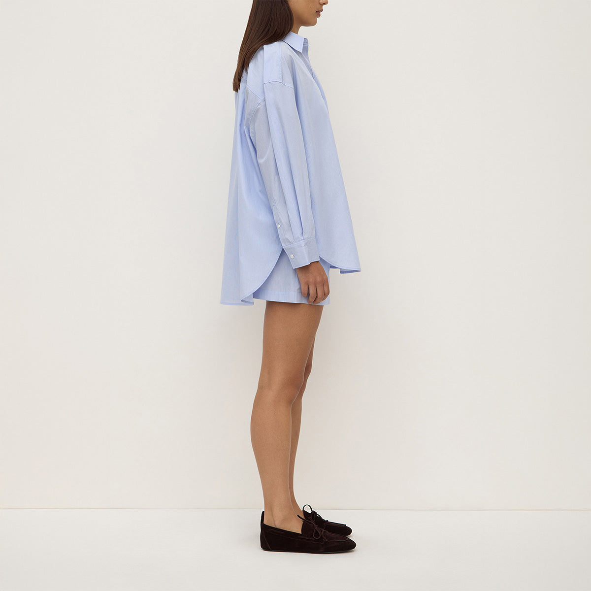 The Havana Stripe Poplin Shirt in blue/white stripe is a 100% cotton long sleeve shirt with a two-piece collar and double button cuffs with sleeve placket.