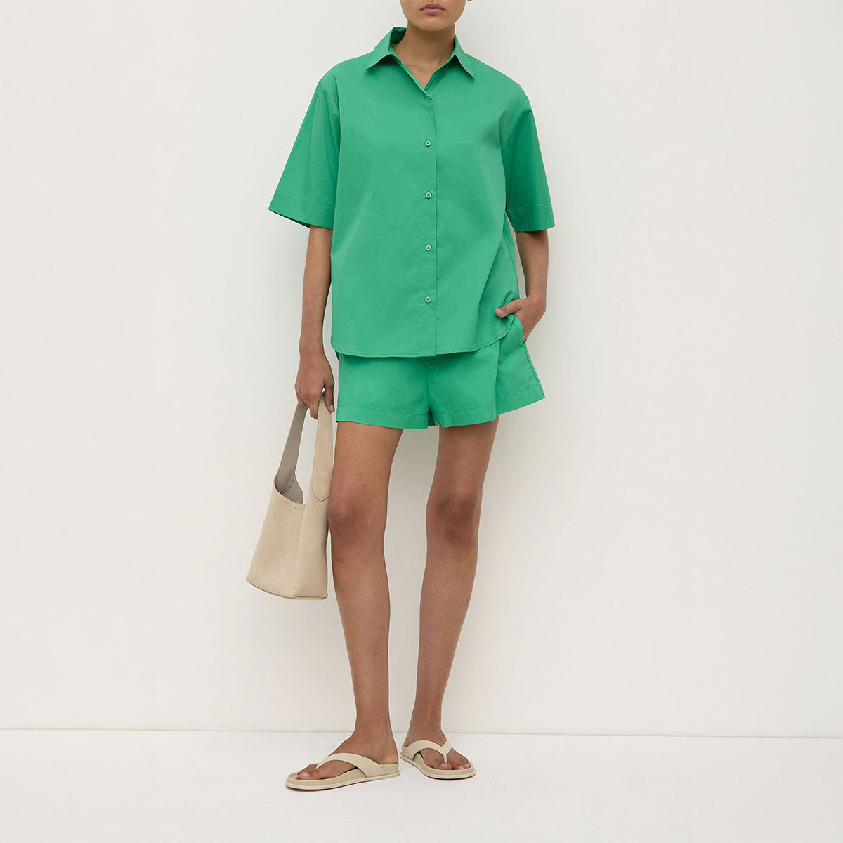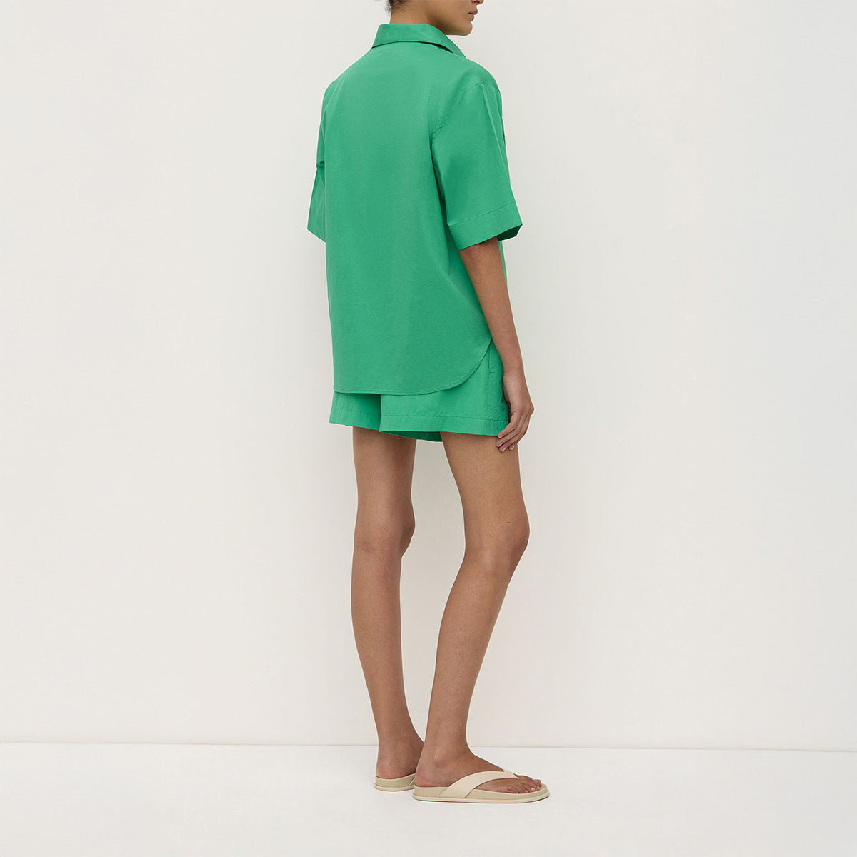 The Joni Short Sleeve Shirt in bright green is a lightweight 100% cotton poplin shirt with an oversized fit, button front, and shaped hem.
