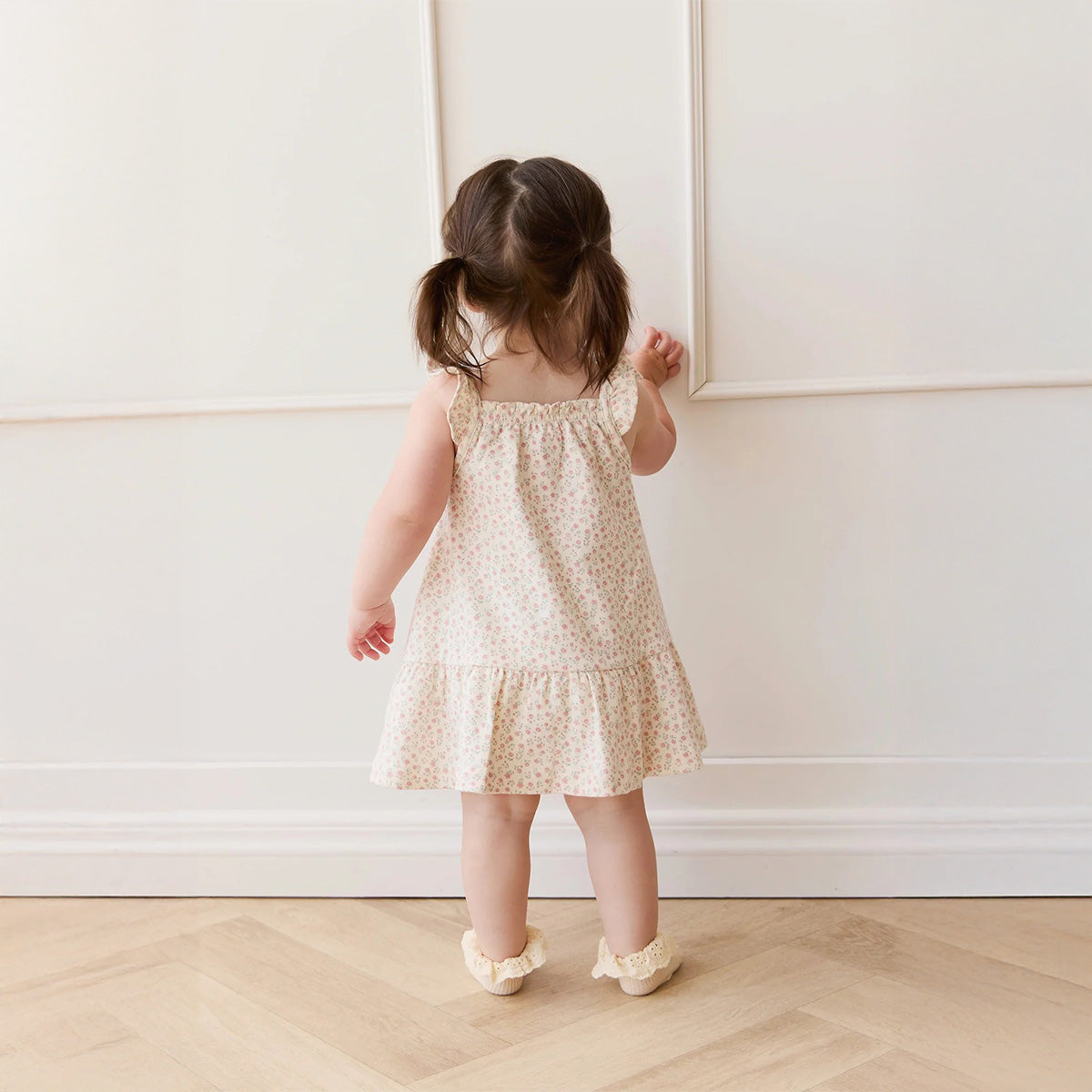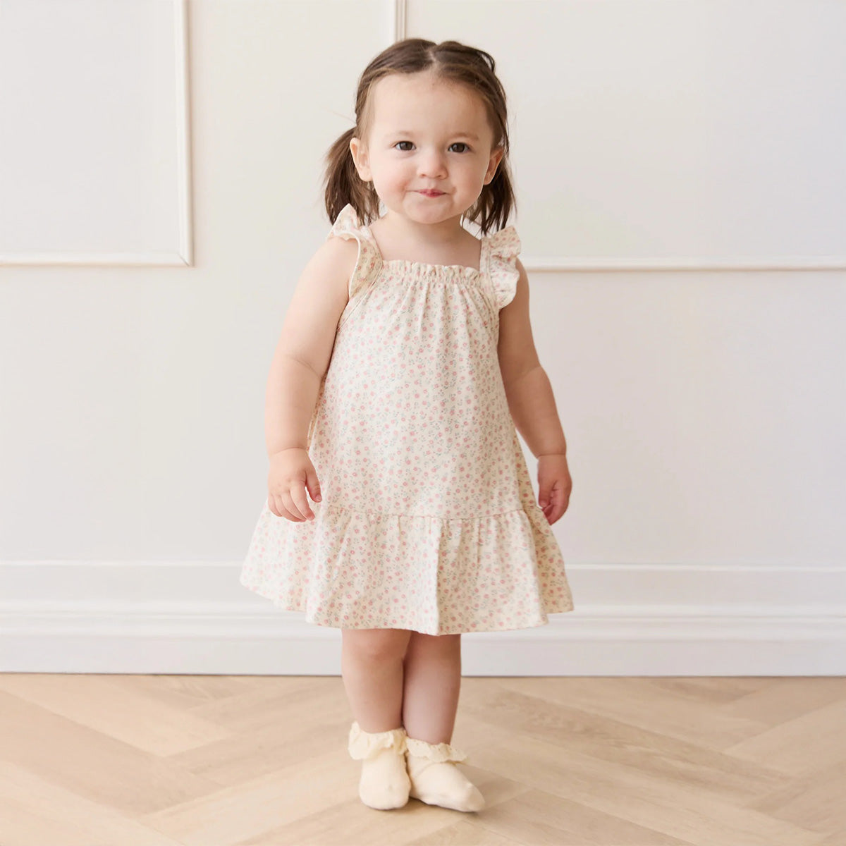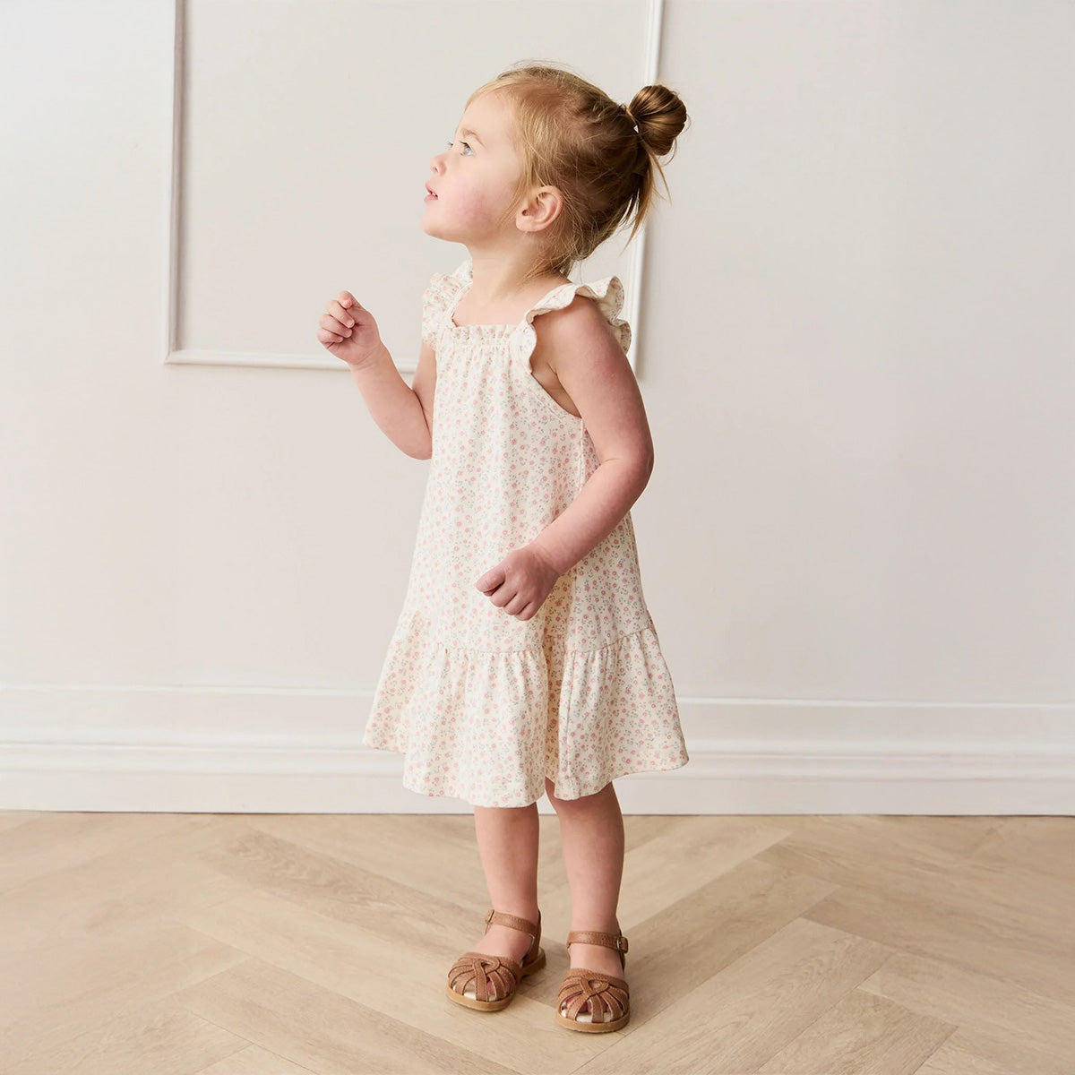 A sweet and timeless piece, the Nelly Dress in Posy Garden Pink is crafted from 100% organic cotton and adorned with a delicate floral print. Featuring ruffled straps, a gathered neckline, and a flared skirt with a soft ruffle hem, this sleeveless dress is perfect for warm days or layered with a cardigan in cooler weather. Light, breathable and beautifully detailed, it’s a must-have for every little wardrobe.