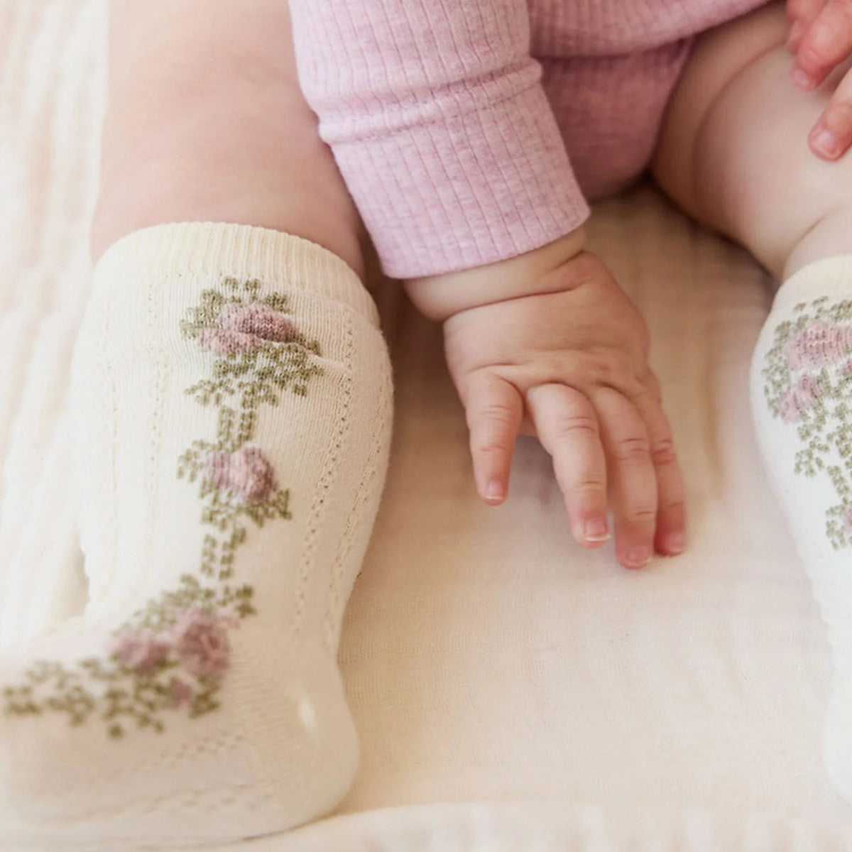 Add a touch of elegance to your little one’s wardrobe with our Tasha Floral Jacquard Sock - Egret. These charming egret socks feature a vertical line of embroidered flowers in soft pink and green tones, bringing a sweet and sophisticated finish to any outfit. Perfect for pairing with dresses, skirts, or layered under boots.