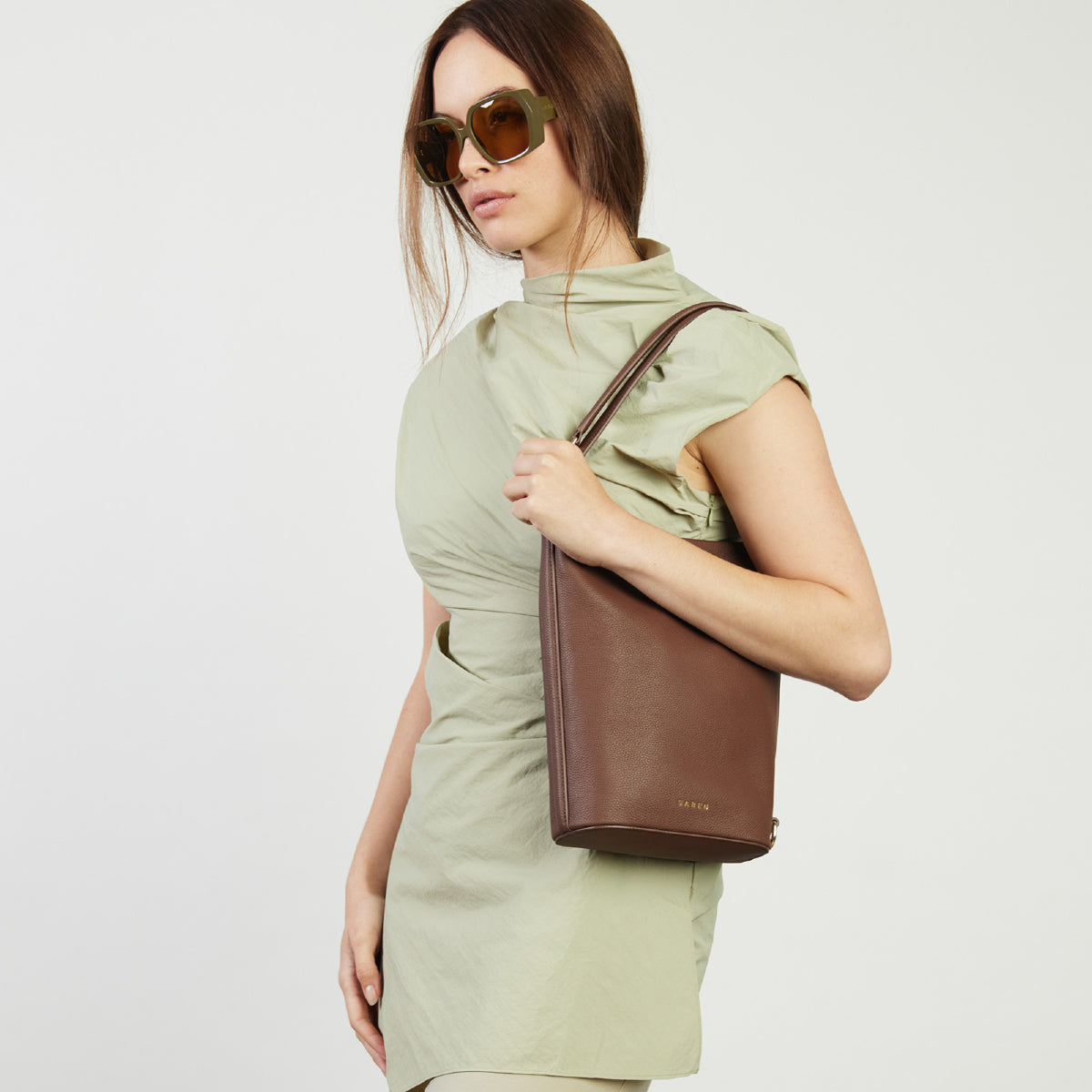 A sleek mid-sized bucket style bag; the smaller sister to the generous bucket tote June. Jojo delivers the same sophisticated functionality in a more compact form. Perfect for those who prefer to carry with intention rather than excess, while maintaining the effortless style transition from shoulder to crossbody wear. Simply unclip the signature SABEN hardware to transform it into a chic crossbody – versatility refined.