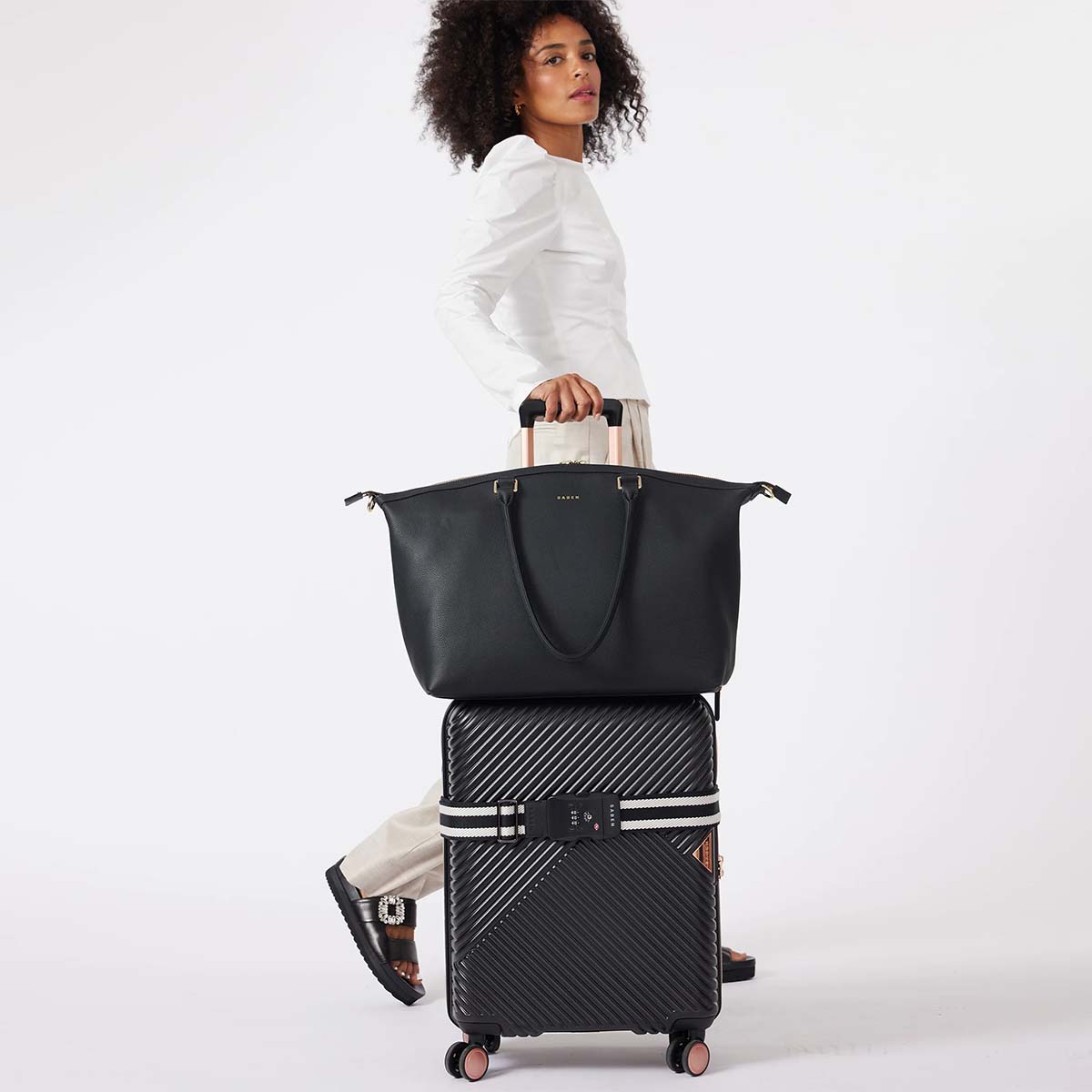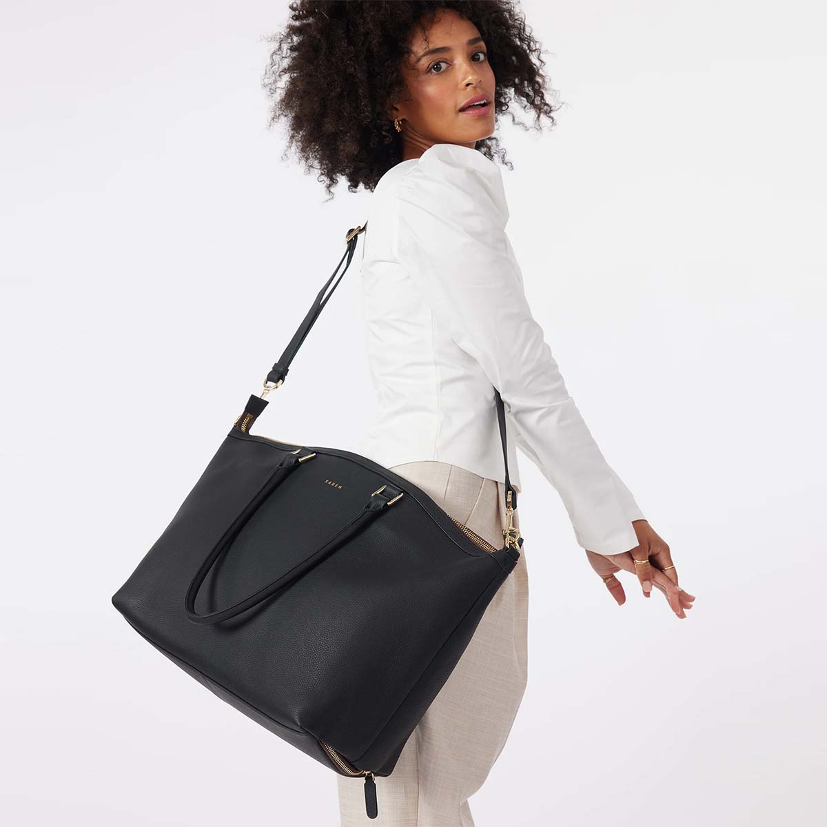 Large enough to fit ALL your essentials, Roma works perfectly as an oversized carry-all, weekend bag, gym bag, hospital bag or carry-on bag. The optional shoulder strap allows you to go hands-free, and subtle suitcase handle sleeve, and passport zip pocket make her the perfect partner for transit.