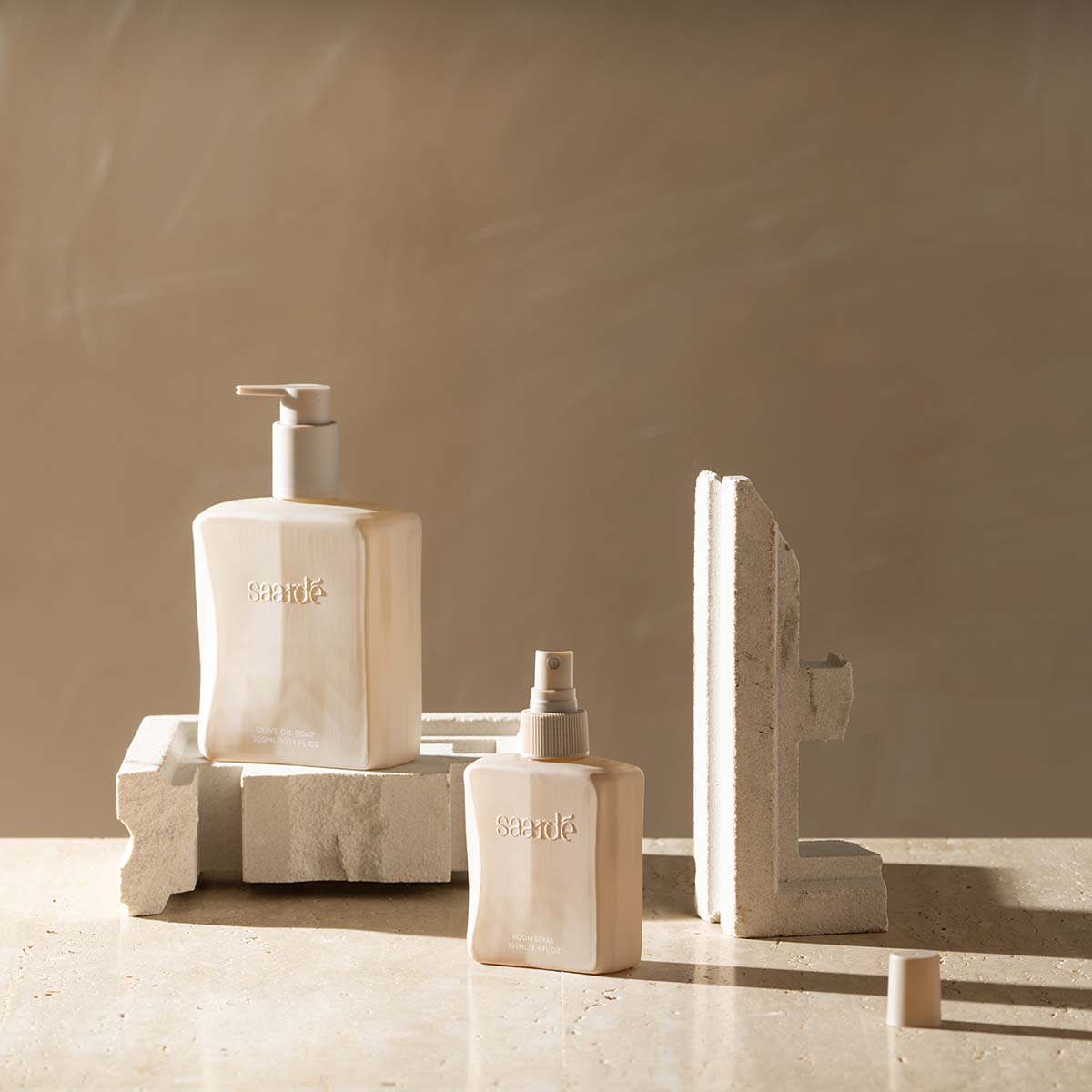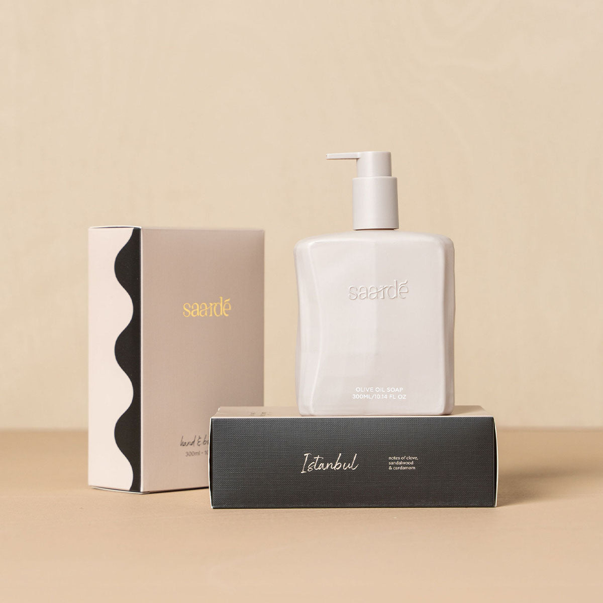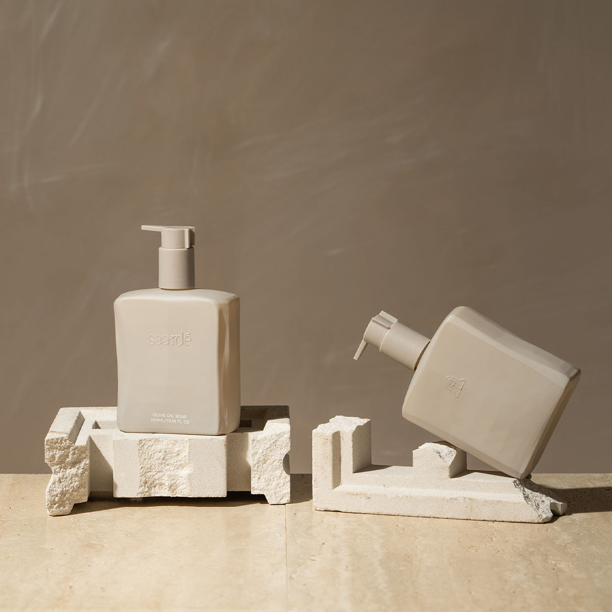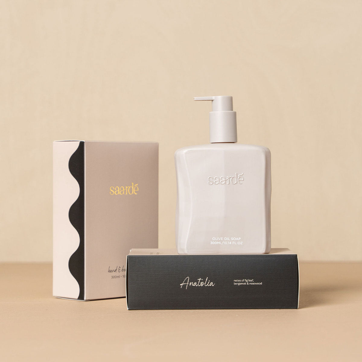 A gentle, natural liquid olive oil hand and body wash in a Saardé signature refillable glass bottle. The process and formulation of this soap were developed over many years to be particularly moisturising and nourishing.