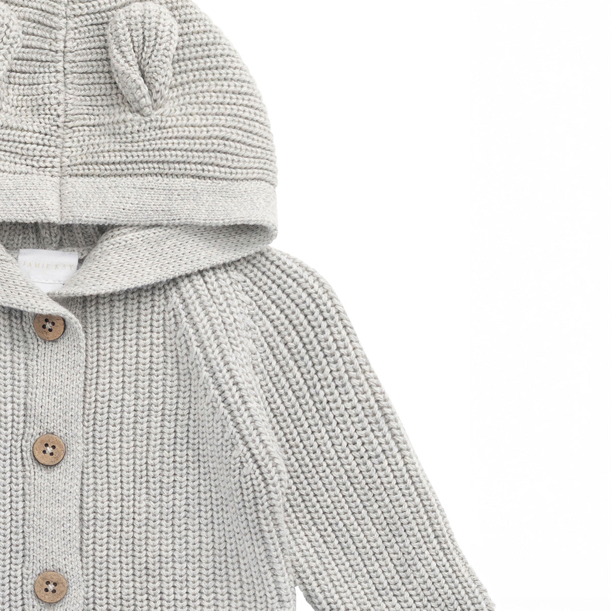 Let your little one snuggle up in the adorable Bear Knit Onepiece in Light Grey Marle. Crafted from 100% cotton, this cosy all-in-one features a soft knit texture, coconut button details, front pockets, and the sweetest bear ears on the hood. Perfect for keeping your child warm while looking irresistibly cute.