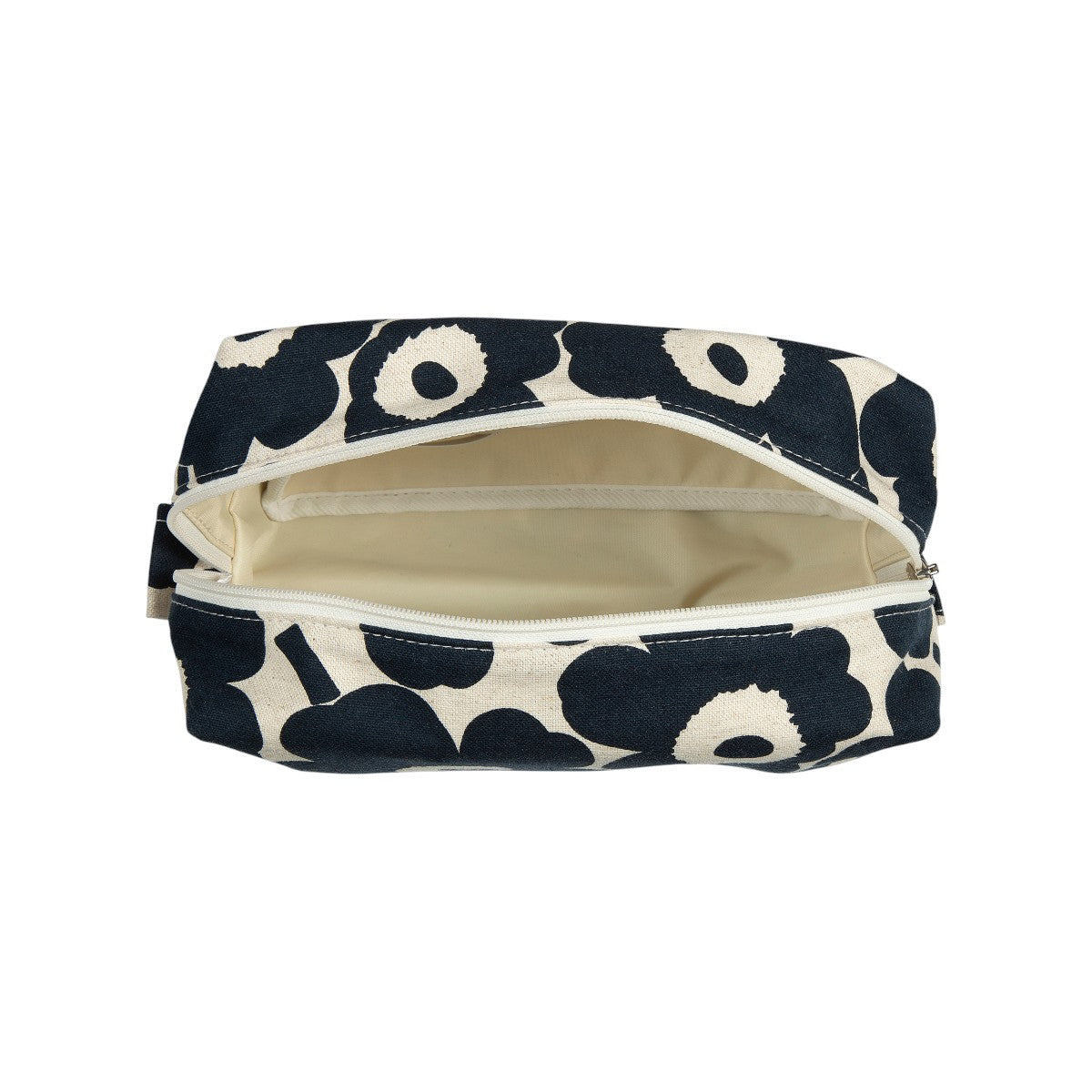 This spacious Vilja cosmetic bag is crafted from a blend of unbleached cotton and linen, with a protective finish to repel stains. The bag features a convenient zipper closure, with a water-resistant nylon lining ideal for stowing skincare and beauty products. Plus, two pockets and brush holders inside offer additional storage options—all set against two stylishly patterned colors.