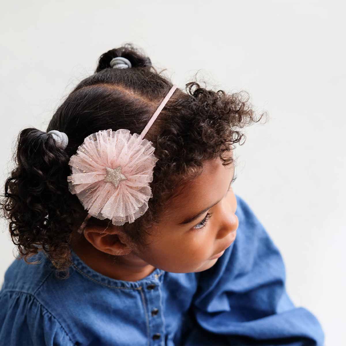 - Grosgrain ribbon wrapped alice band featuring tutu inspired, soft pink glitter speckled tulle with gold glitter star to centre
