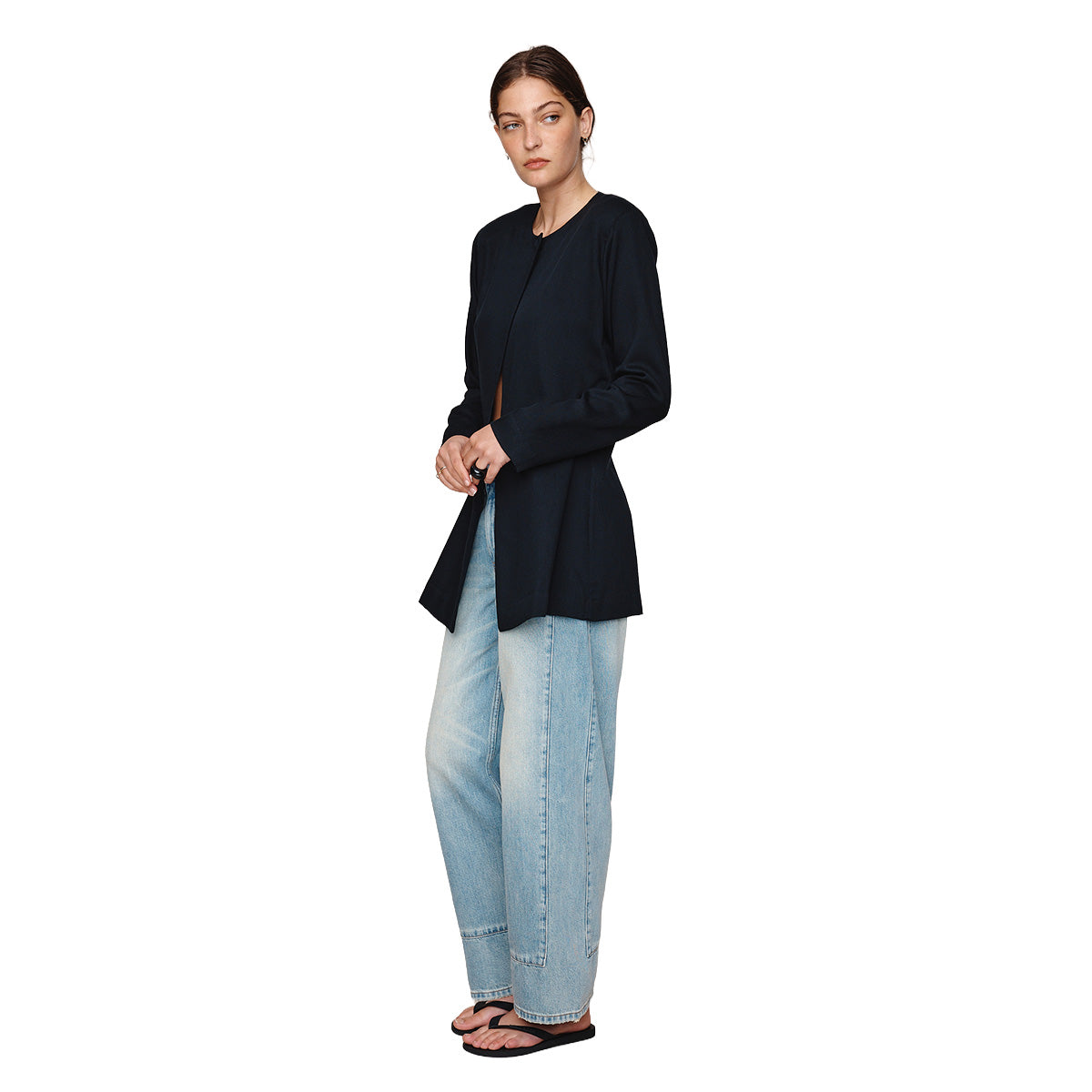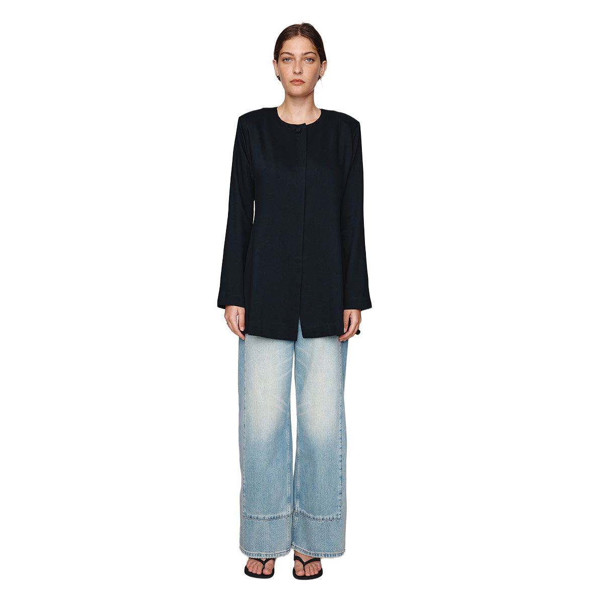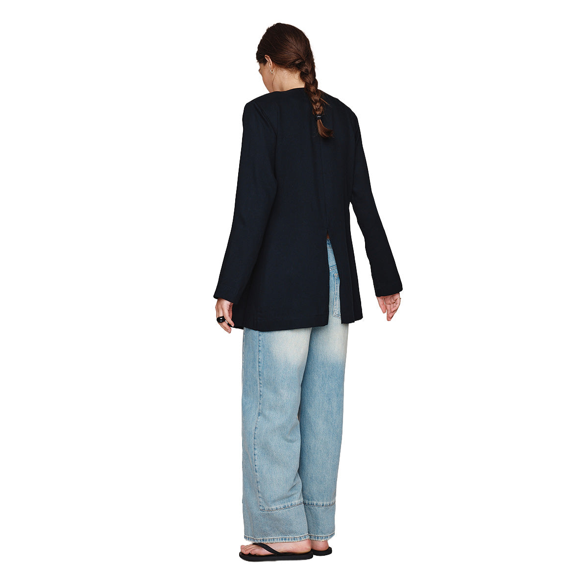 This longline jacket is crafted from a textured Tencel / Wool blend that offers a soft, structured drape. Designed with a clean, collarless neckline, it features a single covered button at the neck and an open front for effortless layering. The relaxed shape is refined with full-length sleeves and a centre-back vent, allowing ease of movement and enhancing the jacket’s fluid shape.