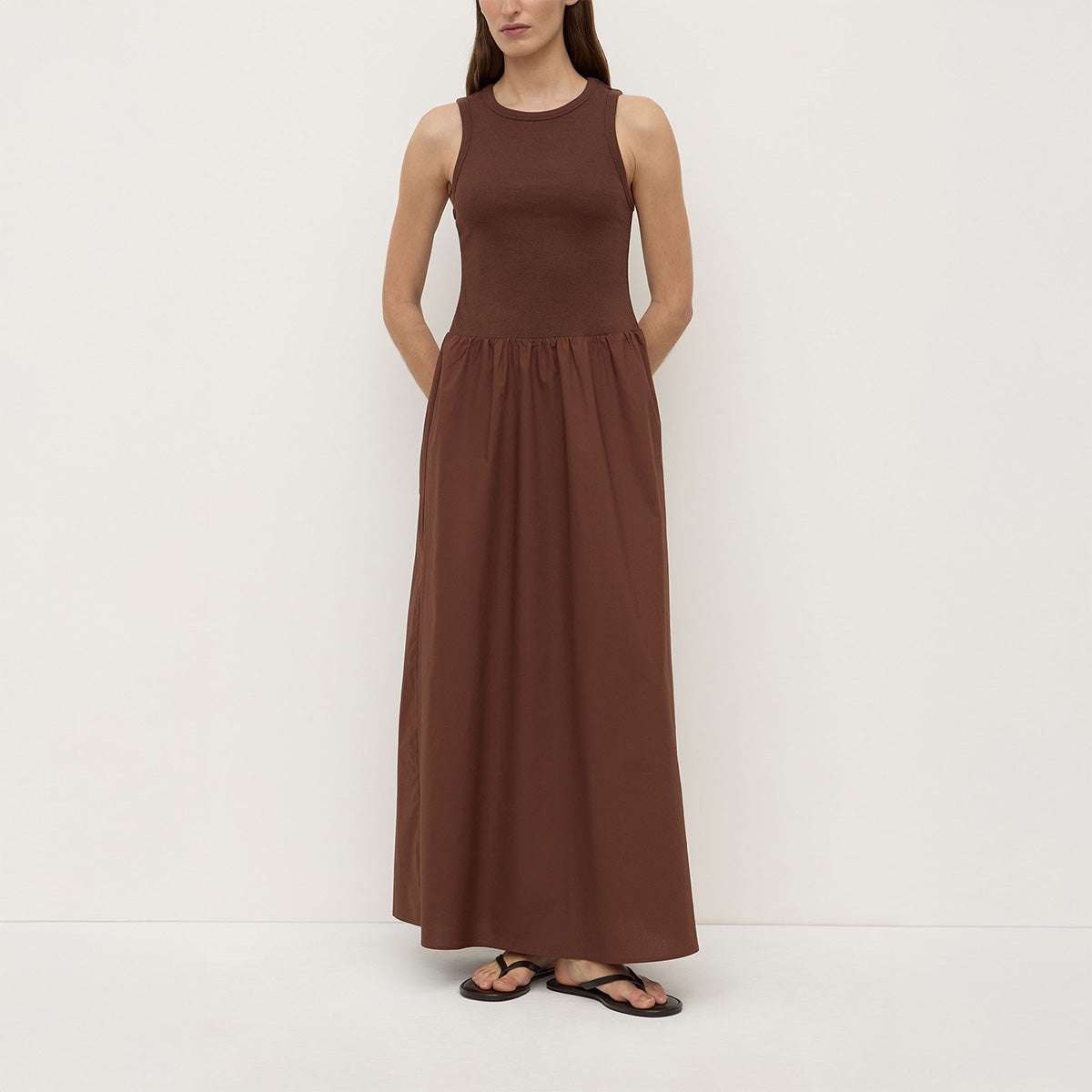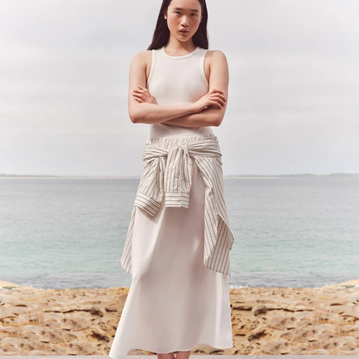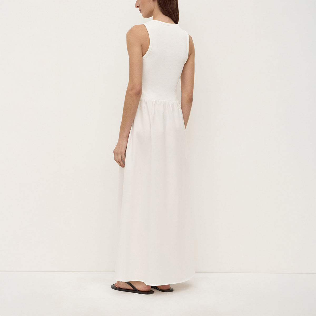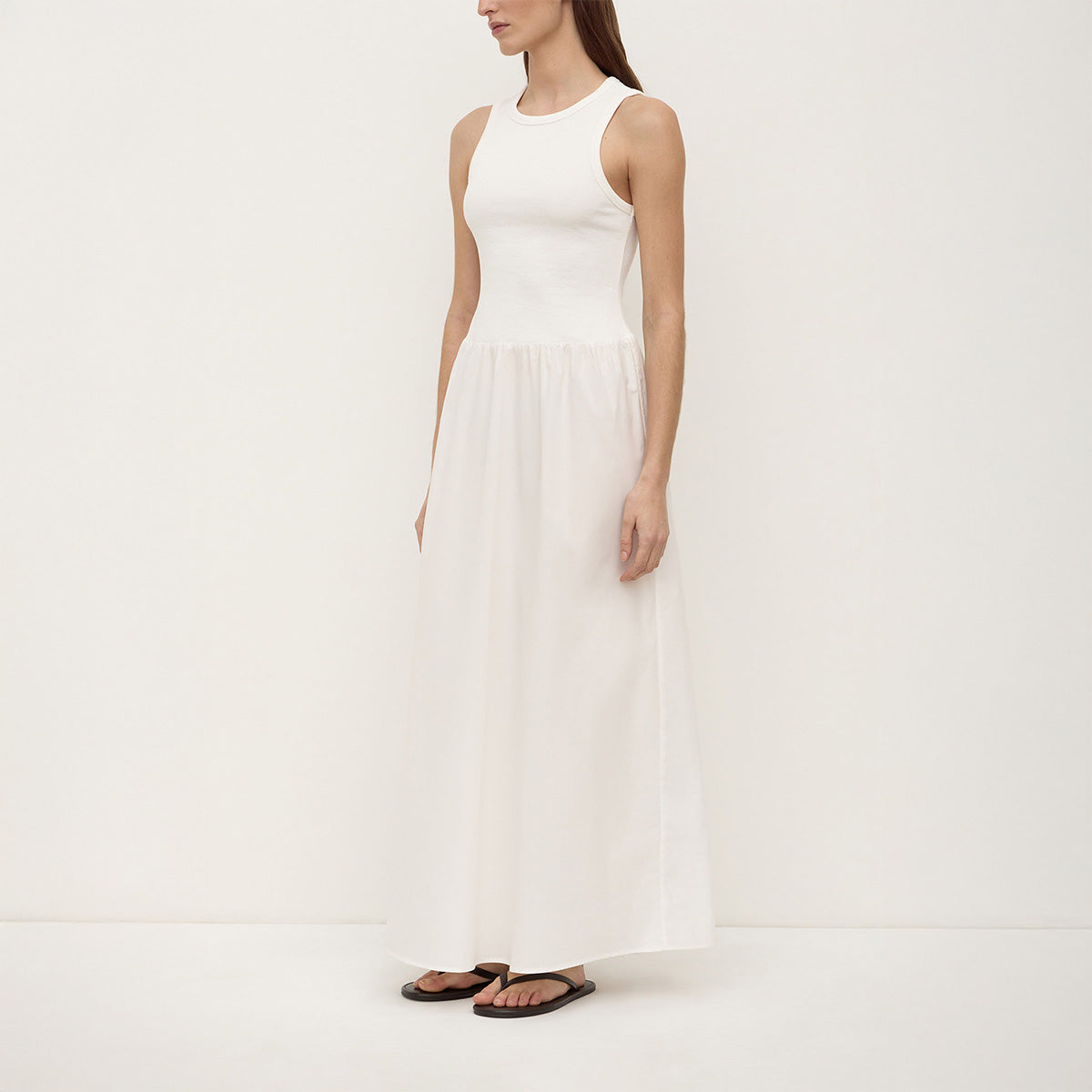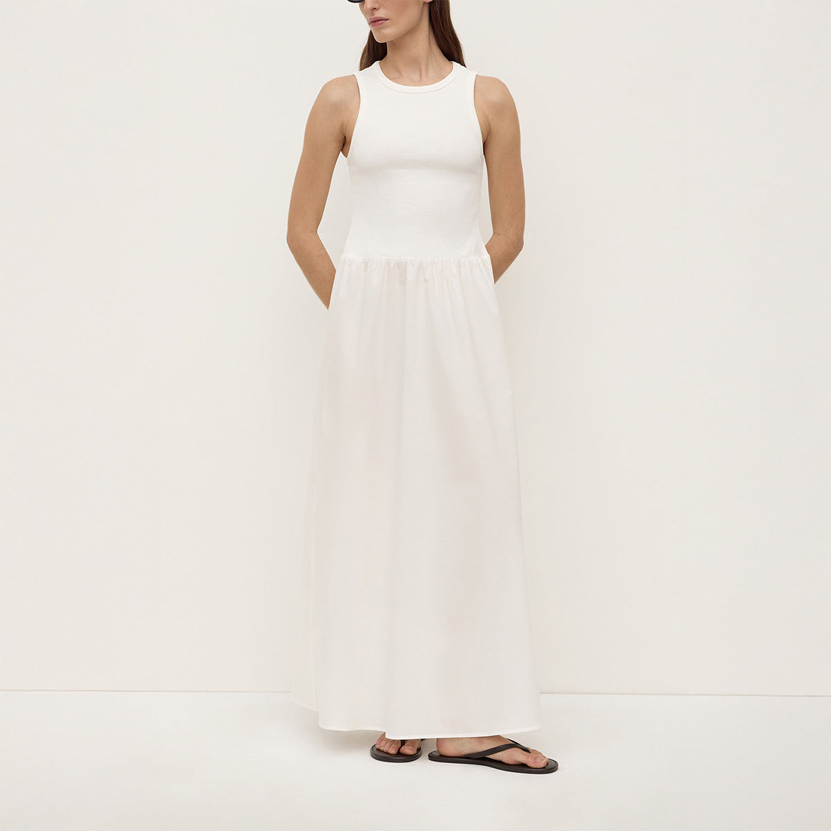 The Kona Maxi Dress in white is a 100% cotton maxi dress with a ribbed bodice, drop waist and full poplin skirt.