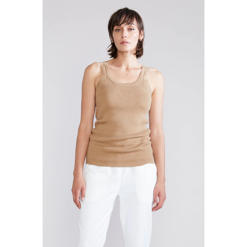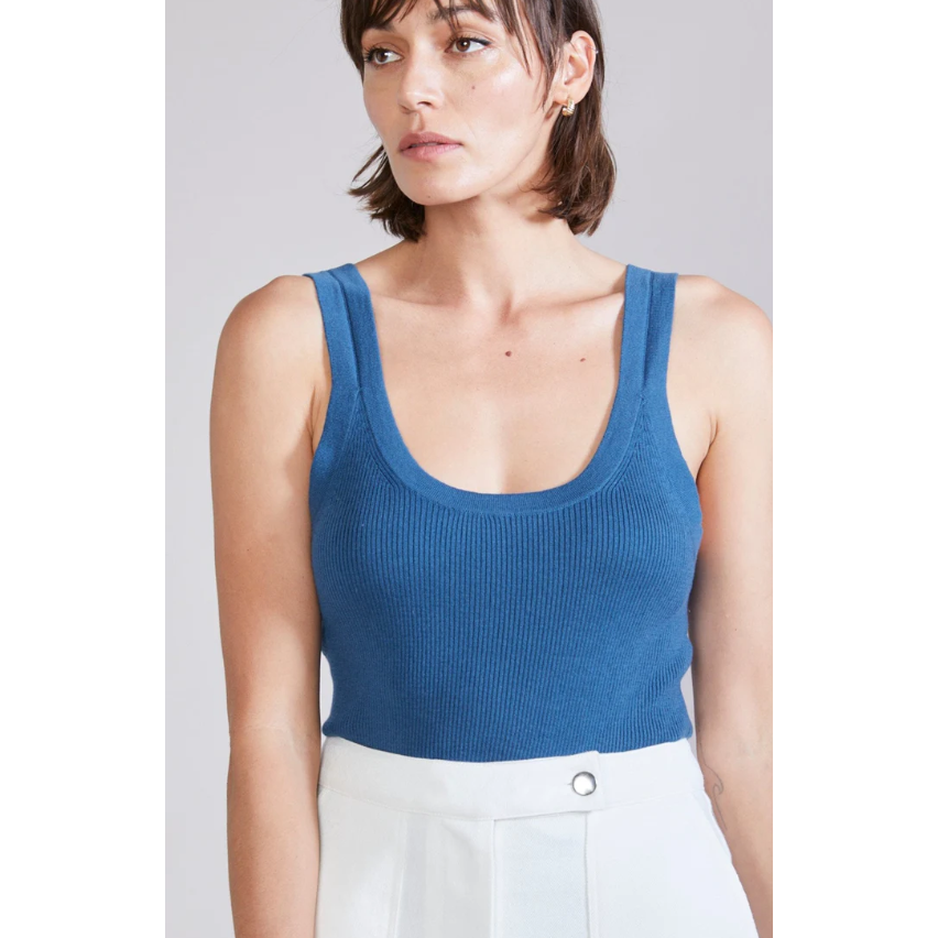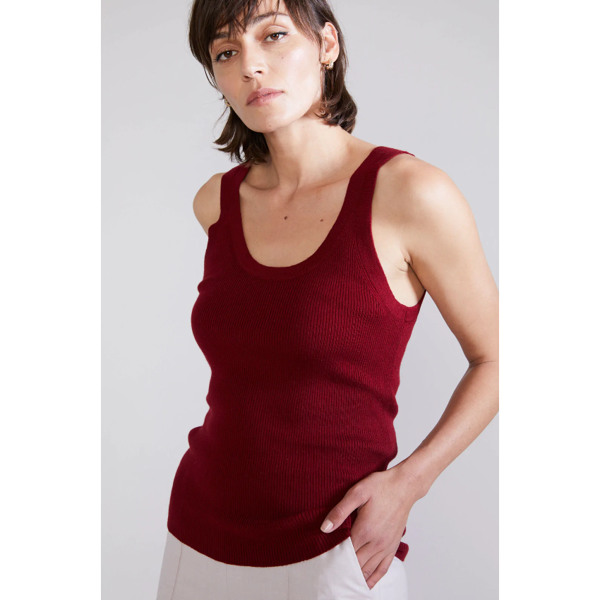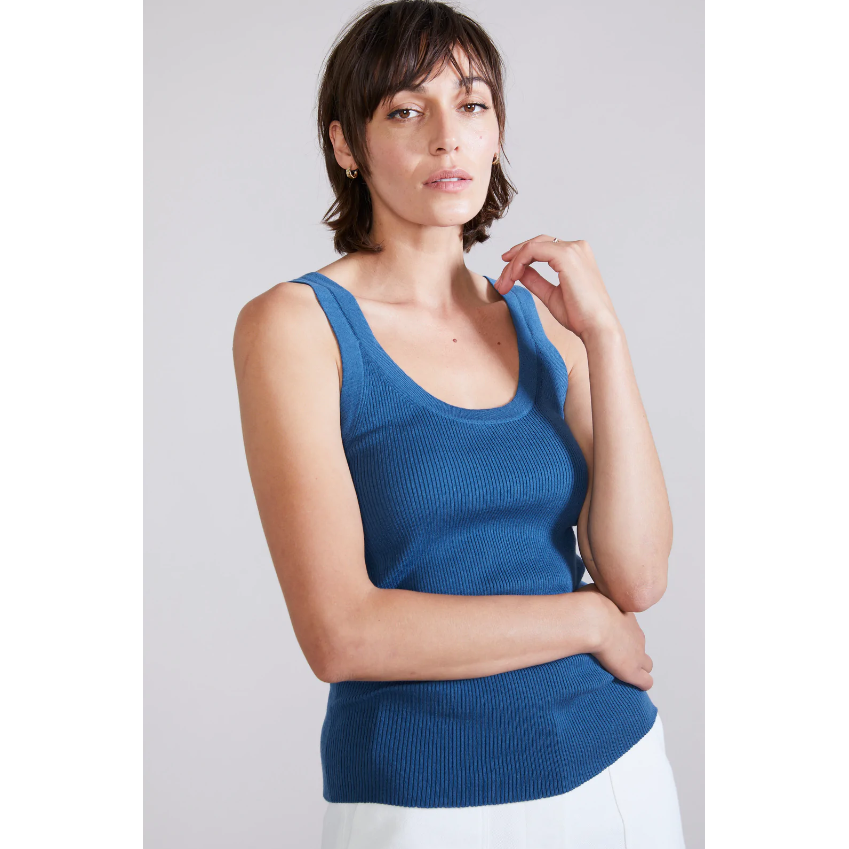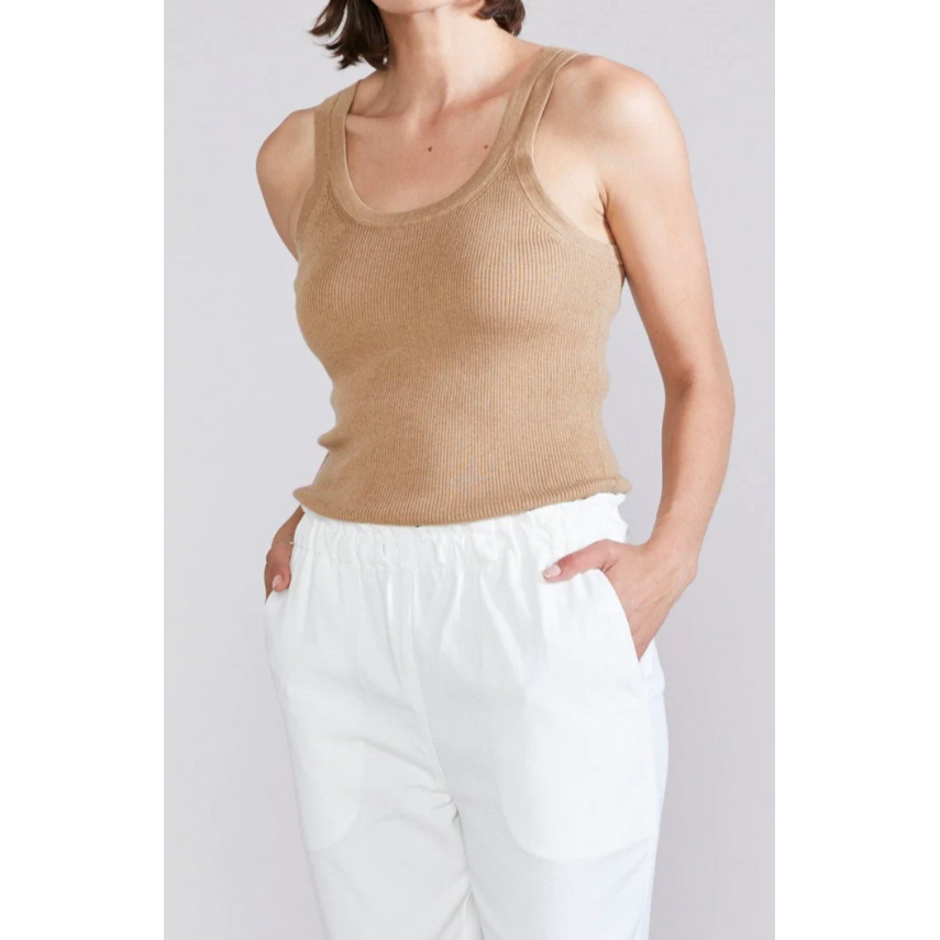 Knitted from our tried and tested Supima cotton & cashmere blend with a fine rib and detailed straps. It has the hand-feel of cashmere, but the coolness of cotton. Designed for a bra to be worn easily underneath with enough length to wear out over skirts and pants or tucked in.