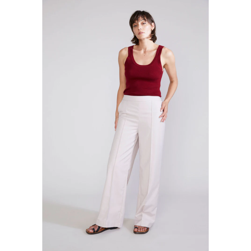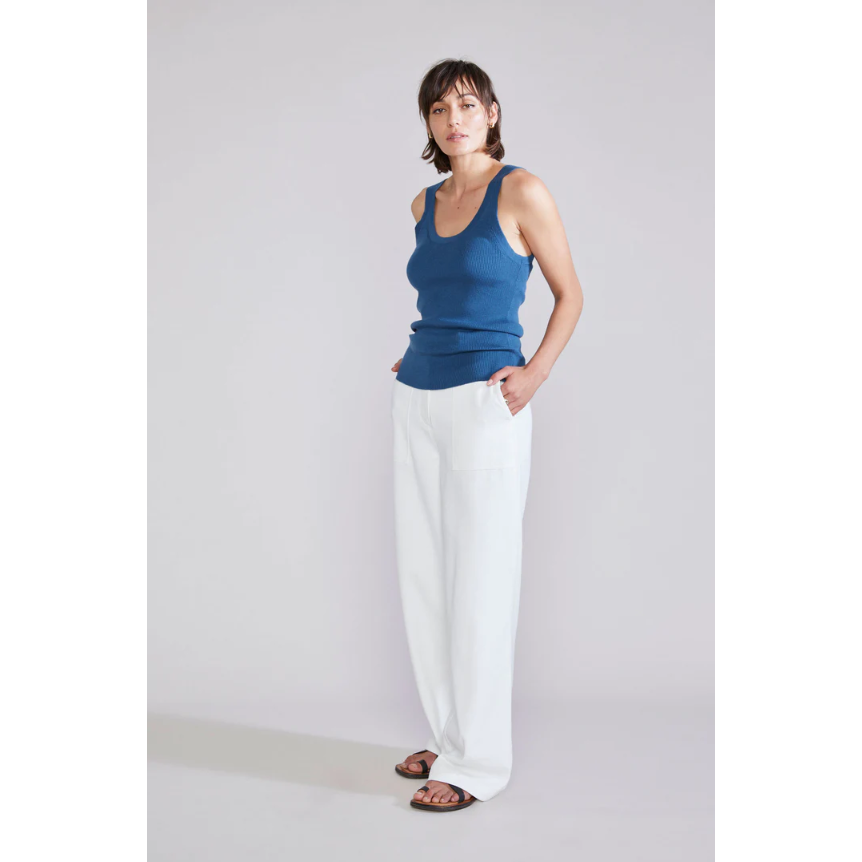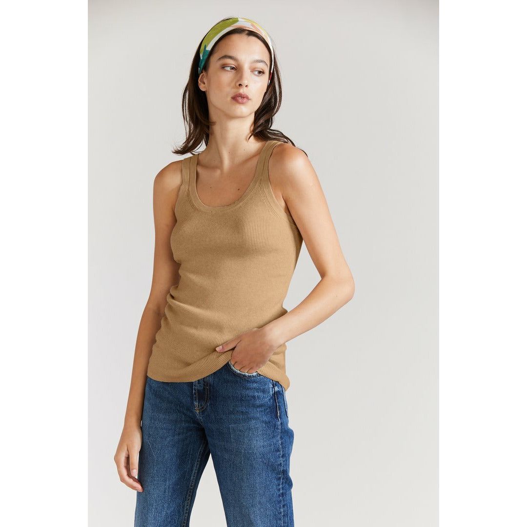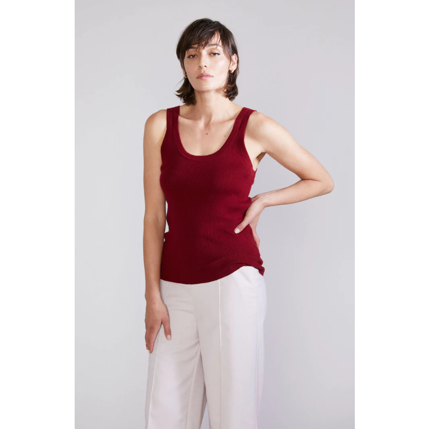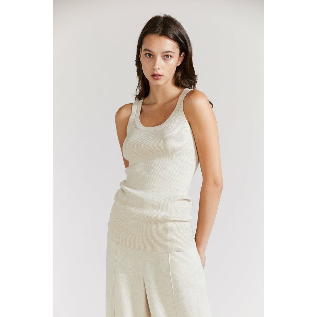 Knitted from our tried and tested Supima cotton & cashmere blend with a fine rib and detailed straps. It has the hand-feel of cashmere, but the coolness of cotton. Designed for a bra to be worn easily underneath with enough length to wear out over skirts and pants or tucked in.