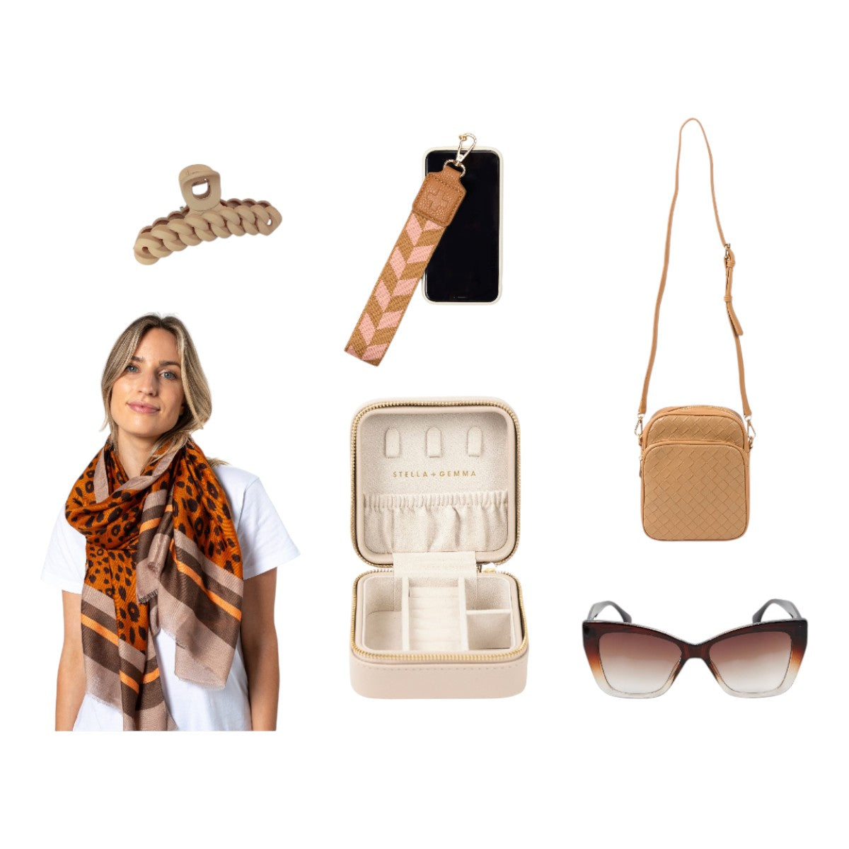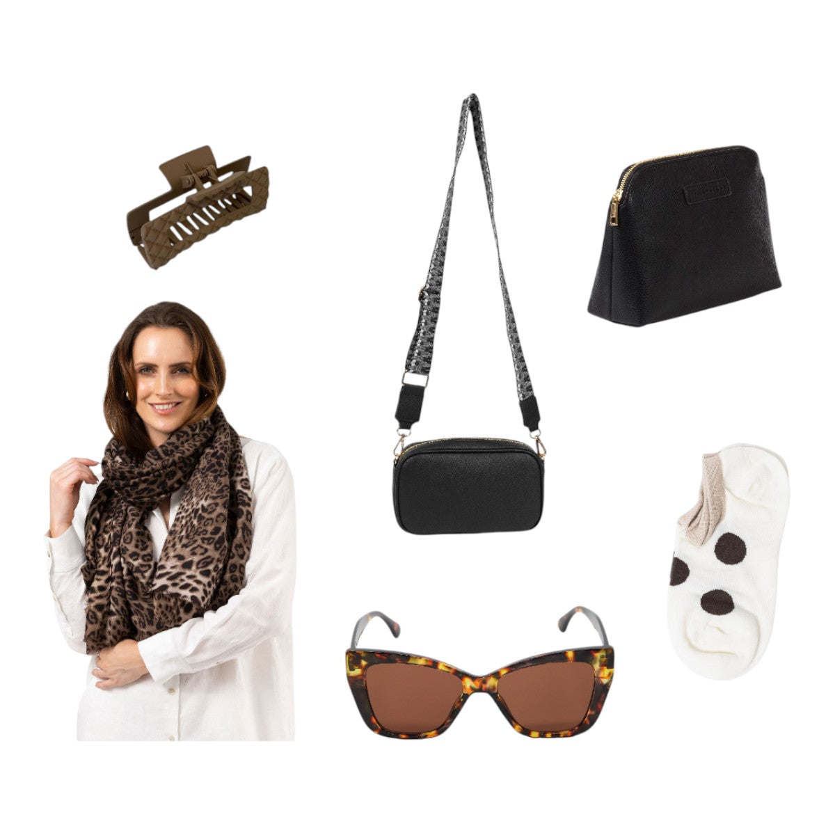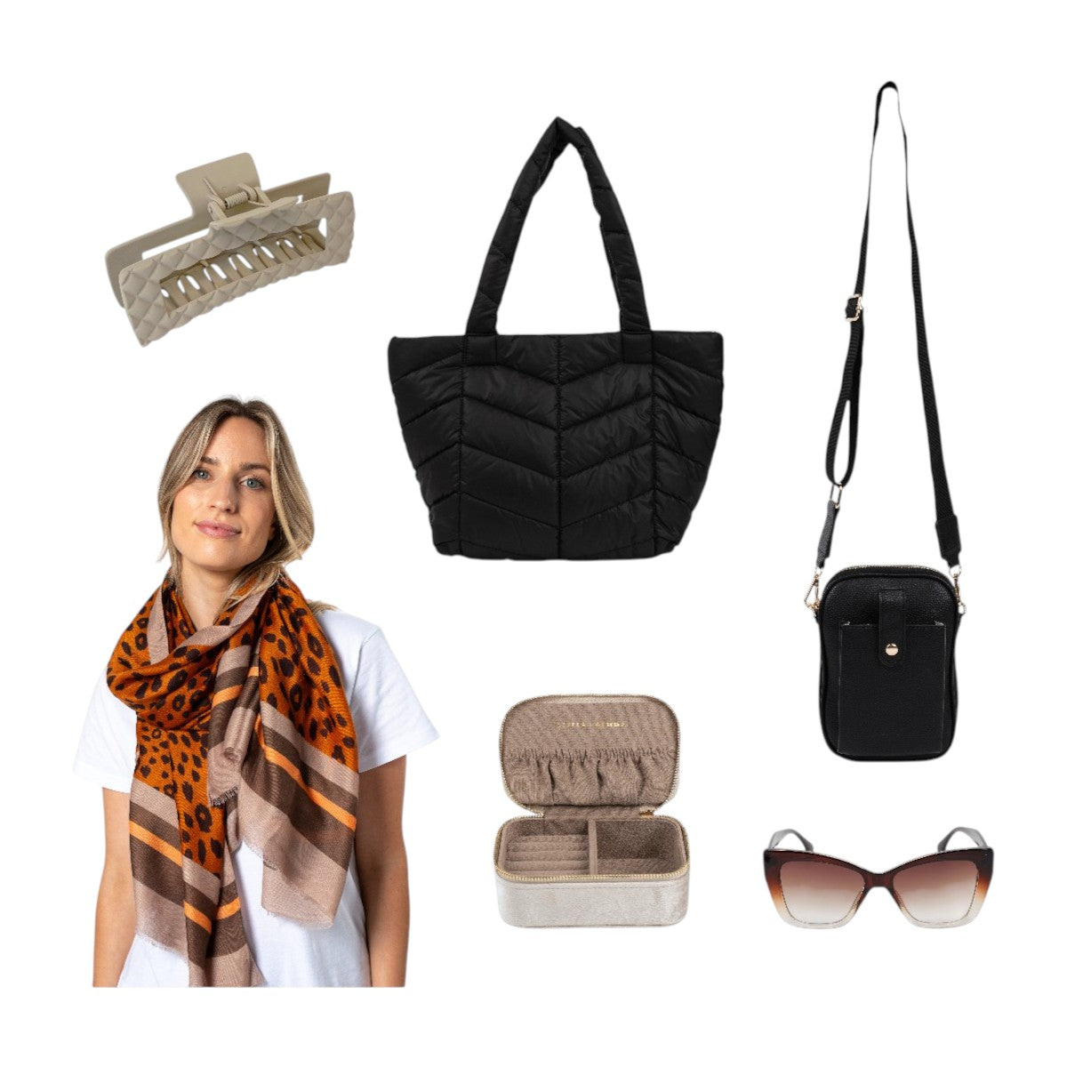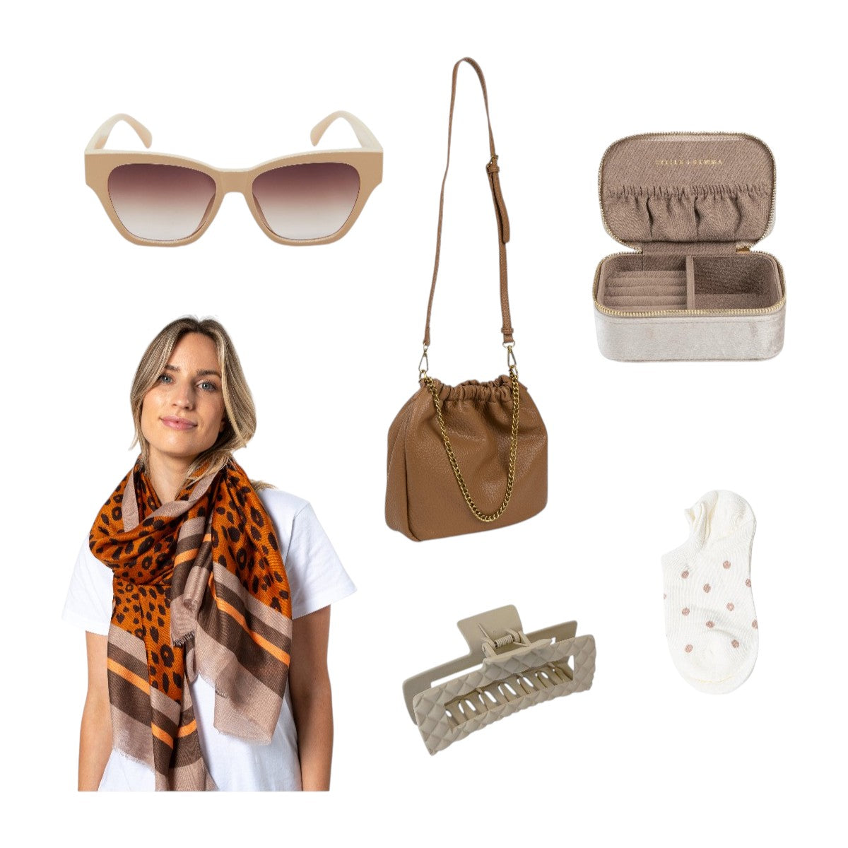 BOX 5: Scarf RRP $49.99, Hair Claw RRP $14.99, Jewellery Box RRP $39.99, Handbag RRP $59.99, Carry All RRP $89.99 and Sunglasses RRP $69.99