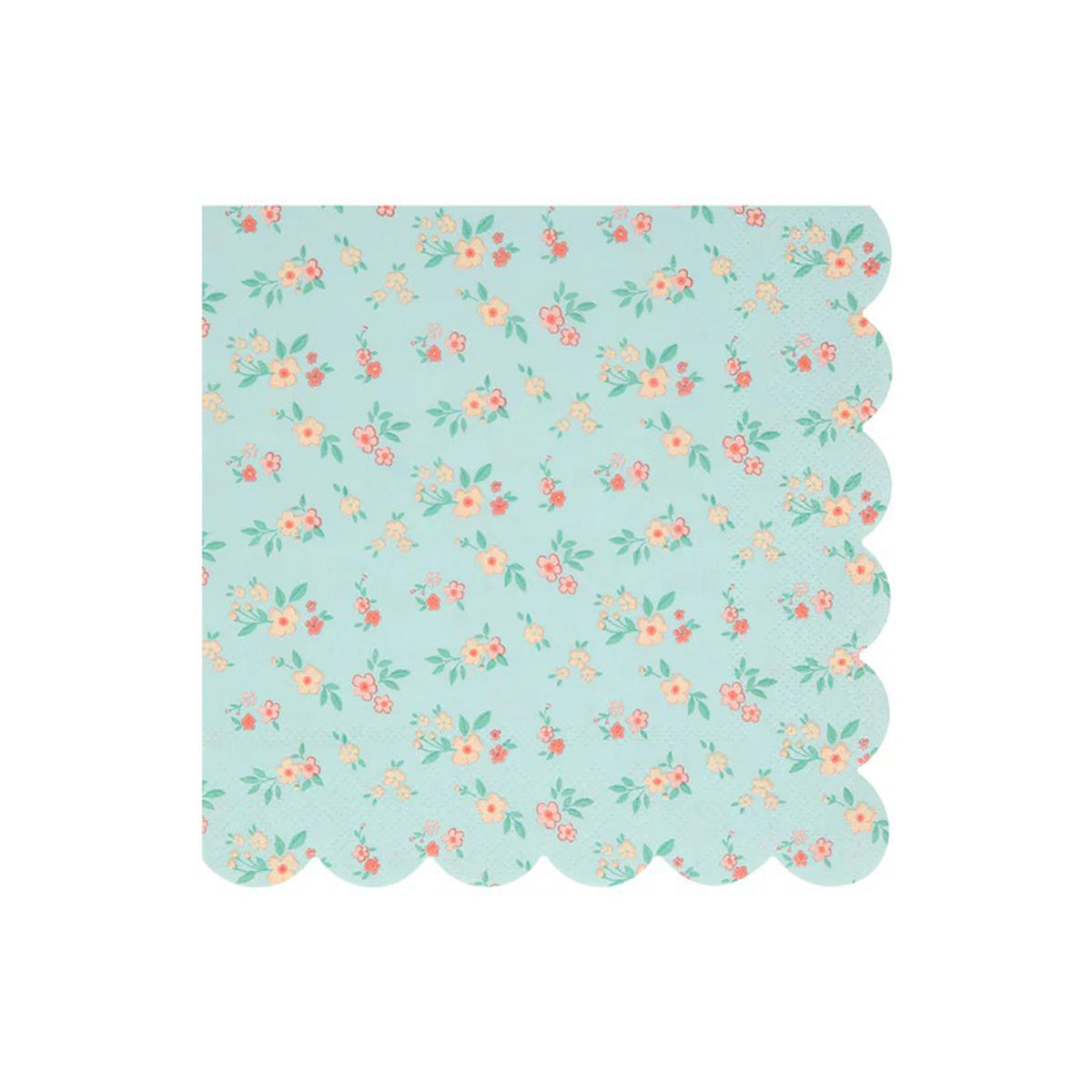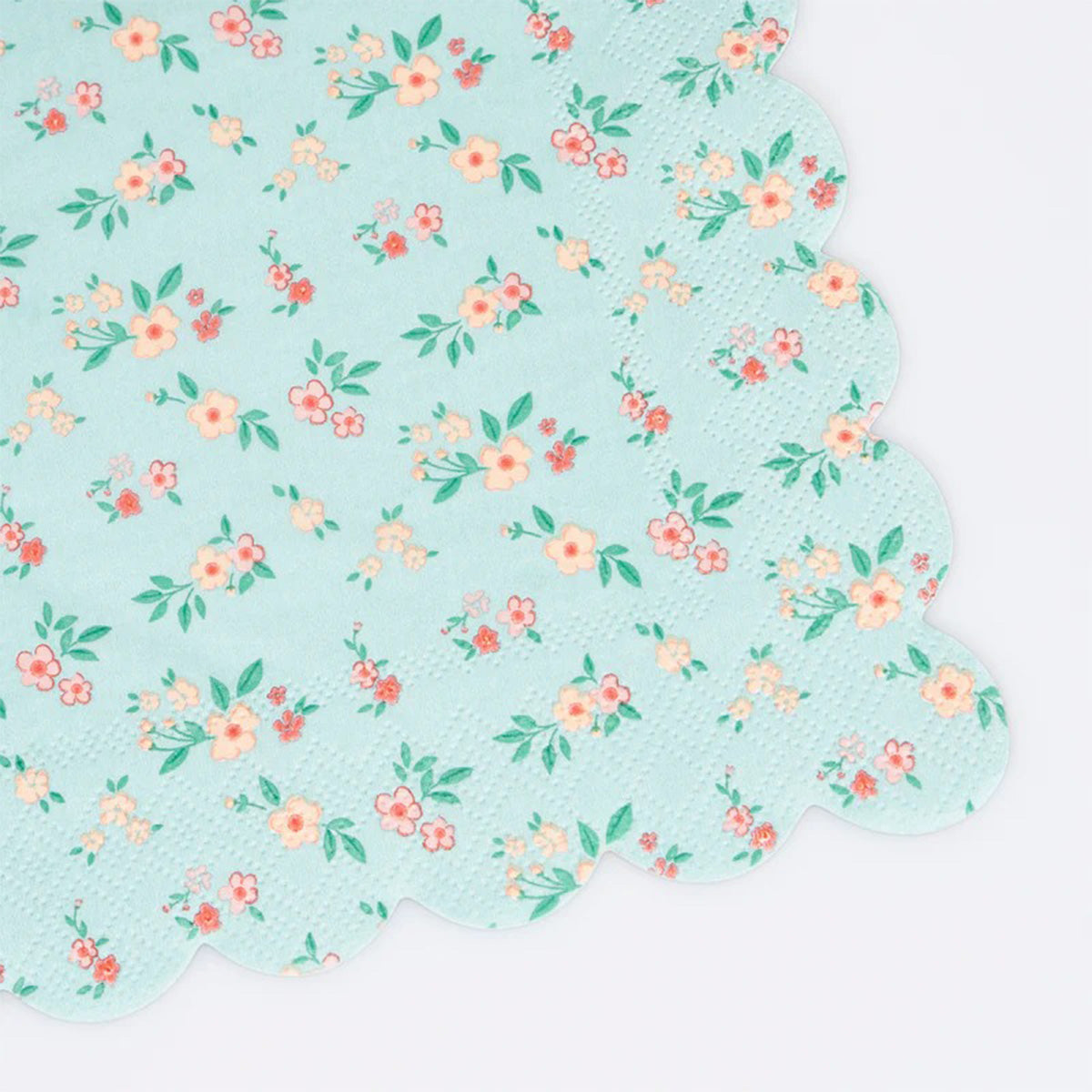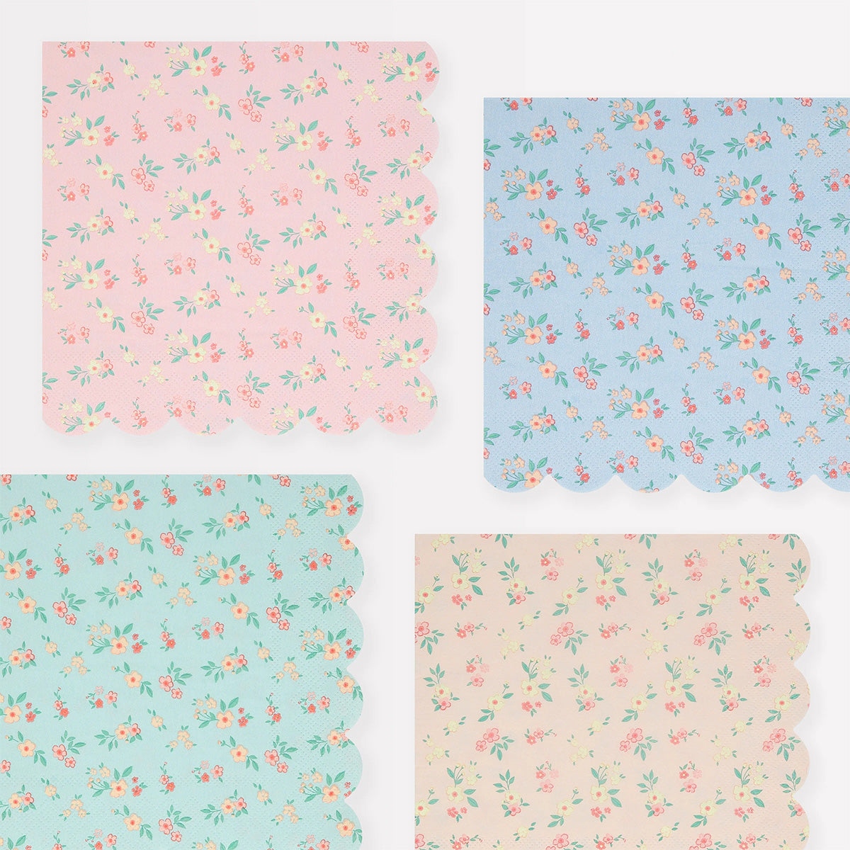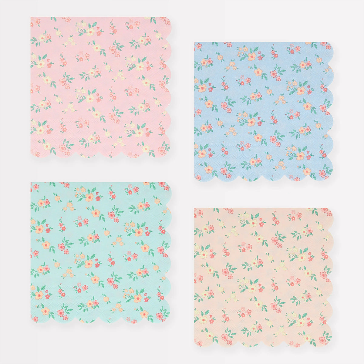 Ditsy floral clusters add effortless elegance to any setting. This classic design is influenced by fashion-forward floral pattern trends, with a scalloped border for a stylish look. The four different vintage color ways, of pink, peach, mint and blue, in this large napkin set are perfect for afternoon tea, garden parties, bridal showers or baby showers.