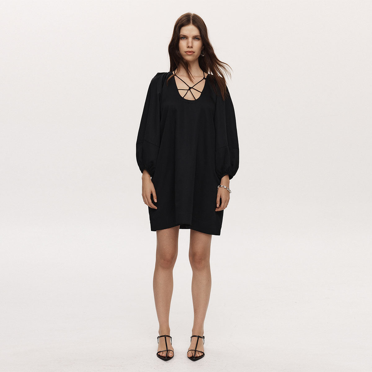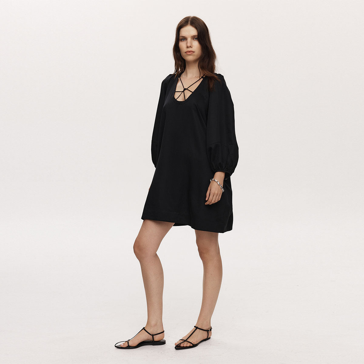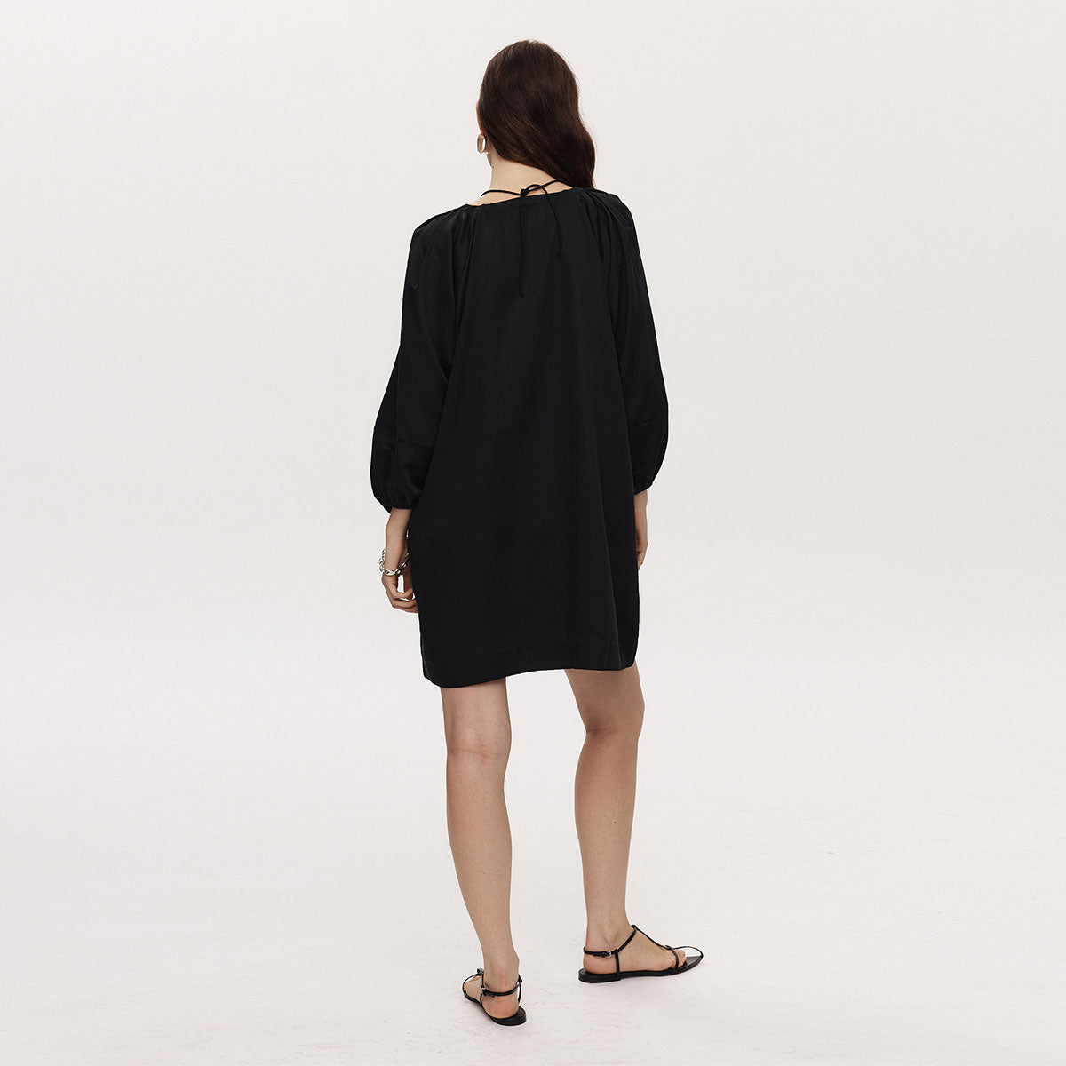 The Winnie Dress features a relaxed silhouette, with a deep round neckline and rouleau tie detailing across the chest that can be adjusted and tied at the top of the neck. This dress has elongated sleeves finished with gathered cuffs and falls at a flattering length, just above the knee. This version of the Winnie Dress is crafted in 100% cotton.